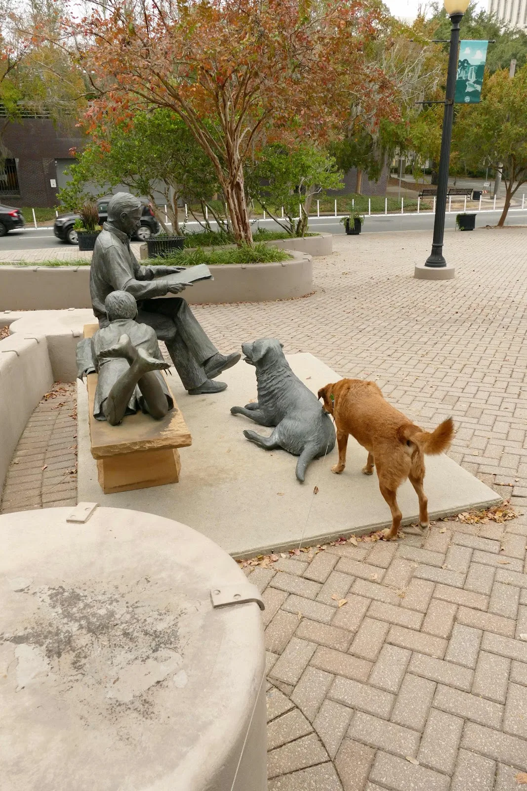 Rusty needed to prove to me that he can see shapes and forms as I watched him get freaked out for a while by a statue of a dog, part of a tableau celebrating literacy.