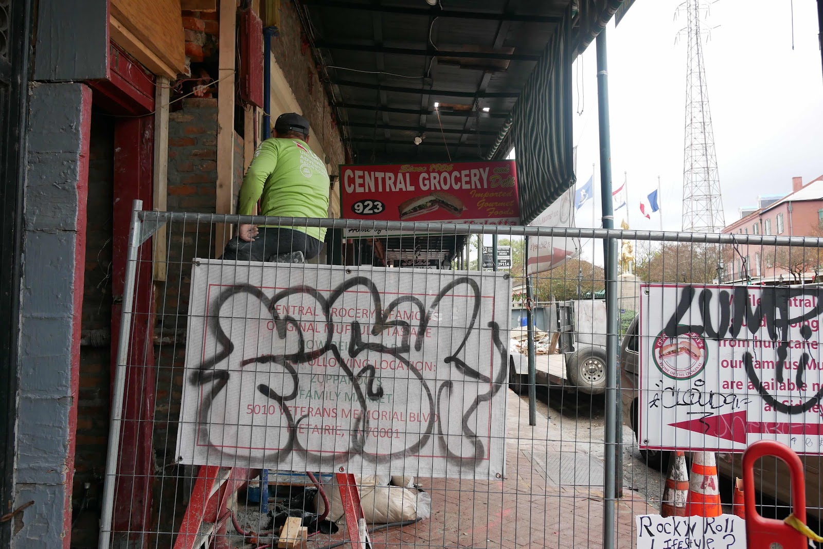 The threat of rain and high winds in the forecast pushed us to go downtown and take a French Quarter walk while the skies were merely gray and not yet dripping. Consequently parking was easy to find even at ten in the morning and no restaurants or coffee shops were open for trade as there were few tourists and apparently no locals in the streets.
