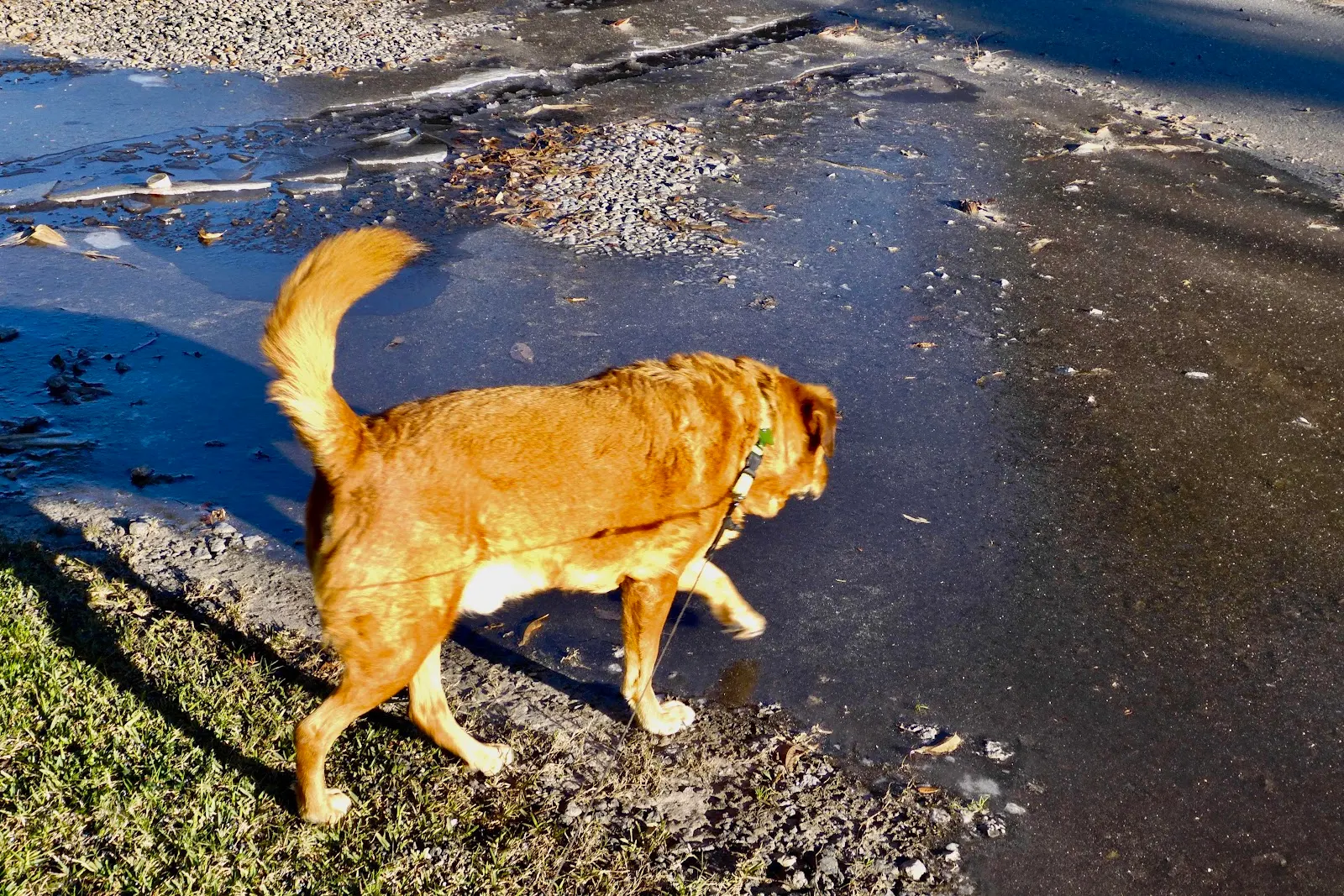 Waking up Christmas Eve morning Rusty decided 8:30 was a good hour to venture out so he came in and woke me yawning ostentatiously as usual. Our walk was frigid with west winds cutting through everything. Even the modest puddles were transformed into things of beauty more or less.
