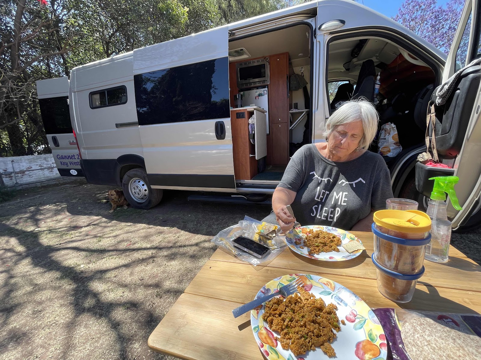 I am glad we are nomads for there are no consequences to an encounter with loneliness, it’s not like moving in to a grump next door; here today, gone tomorrow. I have no answers to the poverty or unhappiness I meet along the way but I don’t fool myself that I count for more than I do and yet I do try to be respectful in my own small way of the customs I meet along the way even if they make no sense to me. Jim interferes and tells people how to manage their lives. Rusty took a dump on the grounds yesterday and a voice started remonstrating which wasn’t real smart, dogs shut when they have to just like us. Yelling don’t stop them. I called out in Spanish to anonymous and said (rather snarkily it must be said) “I’m here, a gringo with a plastic bag. All is well.” The voice said nothing as I picked up Rusty’s eggs. No anonymous voice called out thank you but I didn’t make an issue of it. I could have pointed out the owner’s huge dogs wander free with no plastic bag in attendance but that’s life in a van. You have to work twice as hard as sensible people of substance in homes to be half as good as them. It’s a choice I make happily. Jim seems to carry resentment and it’s a shame he berated locals as he goes. Perhaps it is travel exhaustion.