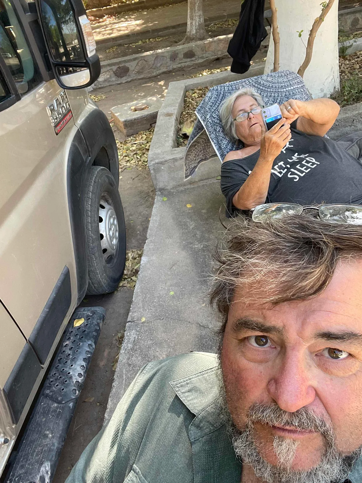 After lunch when the day heats up we retreat to “our” shaded loungers by the pool with earbuds where the WiFi signal lets us listen to music or watch videos between dips. The van is buttoned up after lunch with the rooftop a/c keeping the interior bearable for when we return. I also scored a major victory on the shore power front when I fixed a battery overcharging problem.
