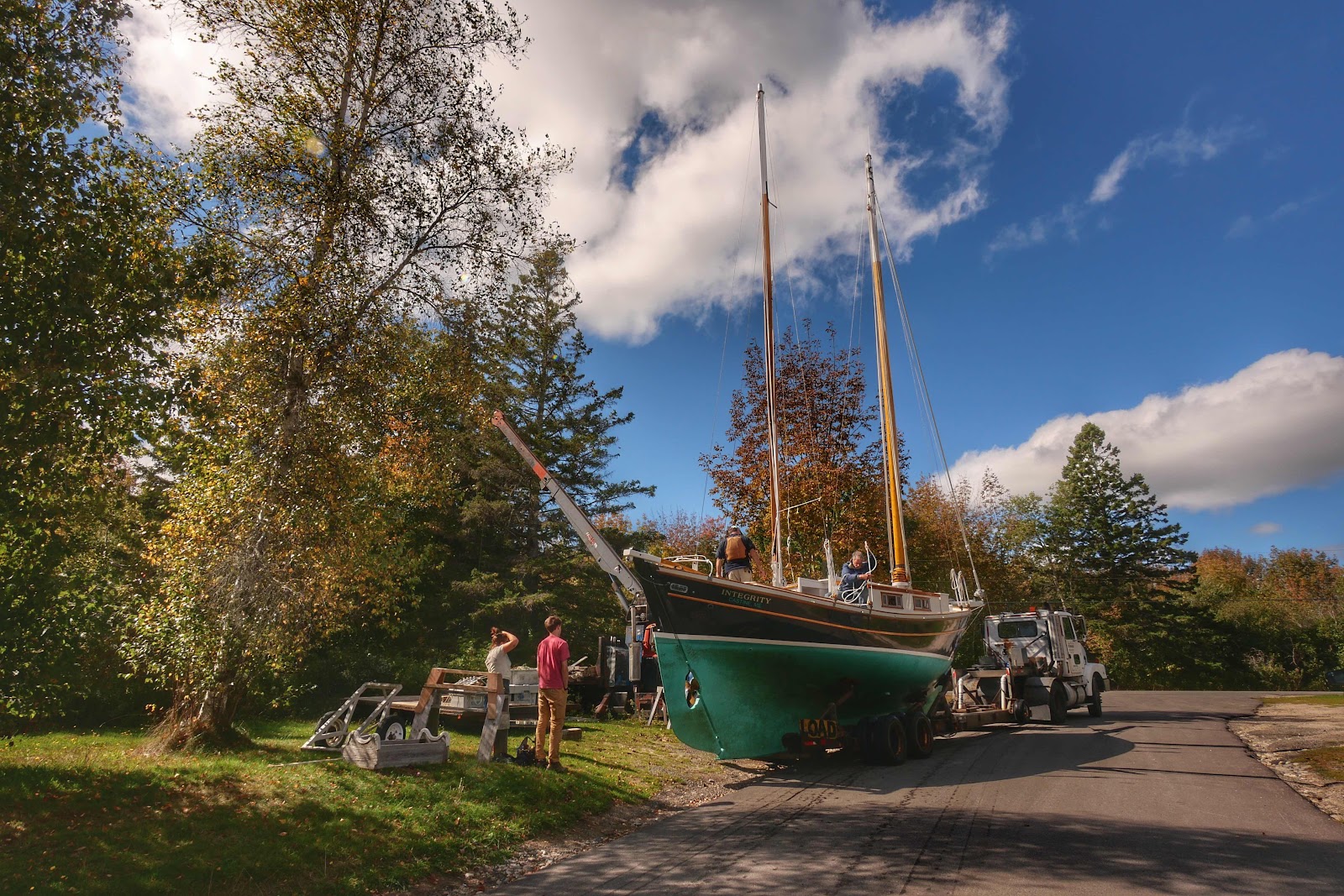 It took two goes with some minor adjustments but the classic you see here was winched onto the submerged hydraulic trailer built by Bill the man by the truck in a baseball cap. He stood with an Xbox in his hands and tweaked the sailboat remotely into his home made adjustable trailer cradle. The sailing season is over and Jonathan wanted me to see this Maine original.