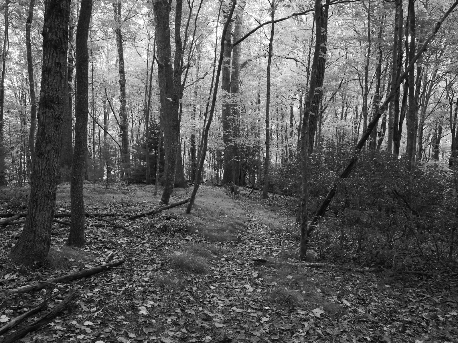 Six years Rusty has lived with us, and I remember his first visit to the forests of Appalachia was filled with terror. The Homestead street dog had never seen deciduous trees or deer the size of elephants. The crackling of the leaves made him jump and me never strayed far from home. This visit he couldn’t edit to get out of the van and disappear into the hemlock bushes.
