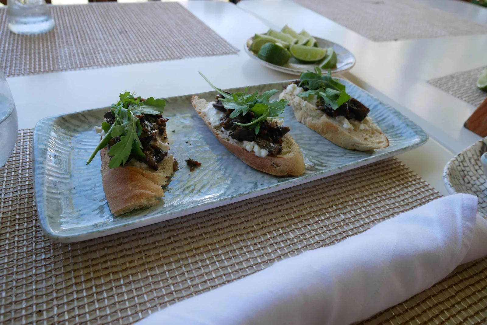 Eggplant on toast. Starters were about ten bucks and the main dishes twenty five.