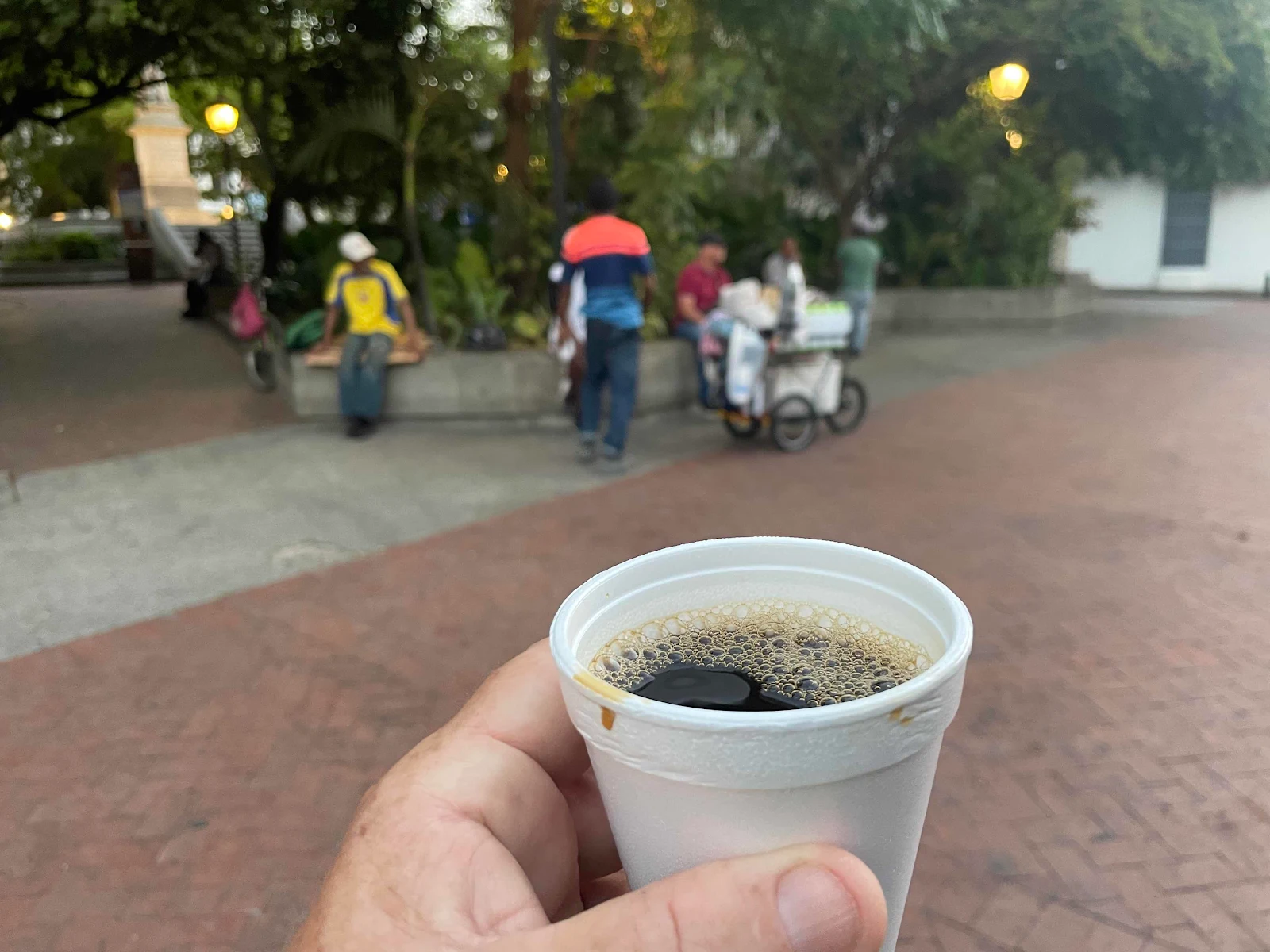 Because she’s a tiny bit more organized than me Layne had some small bills to buy a 75 cent cup of coffee from one of the many street vendors loaded with Thermos flasks serving the workers and early risers. This one was strong and sweet, more like a Cuban coffee than most I’ve tasted.