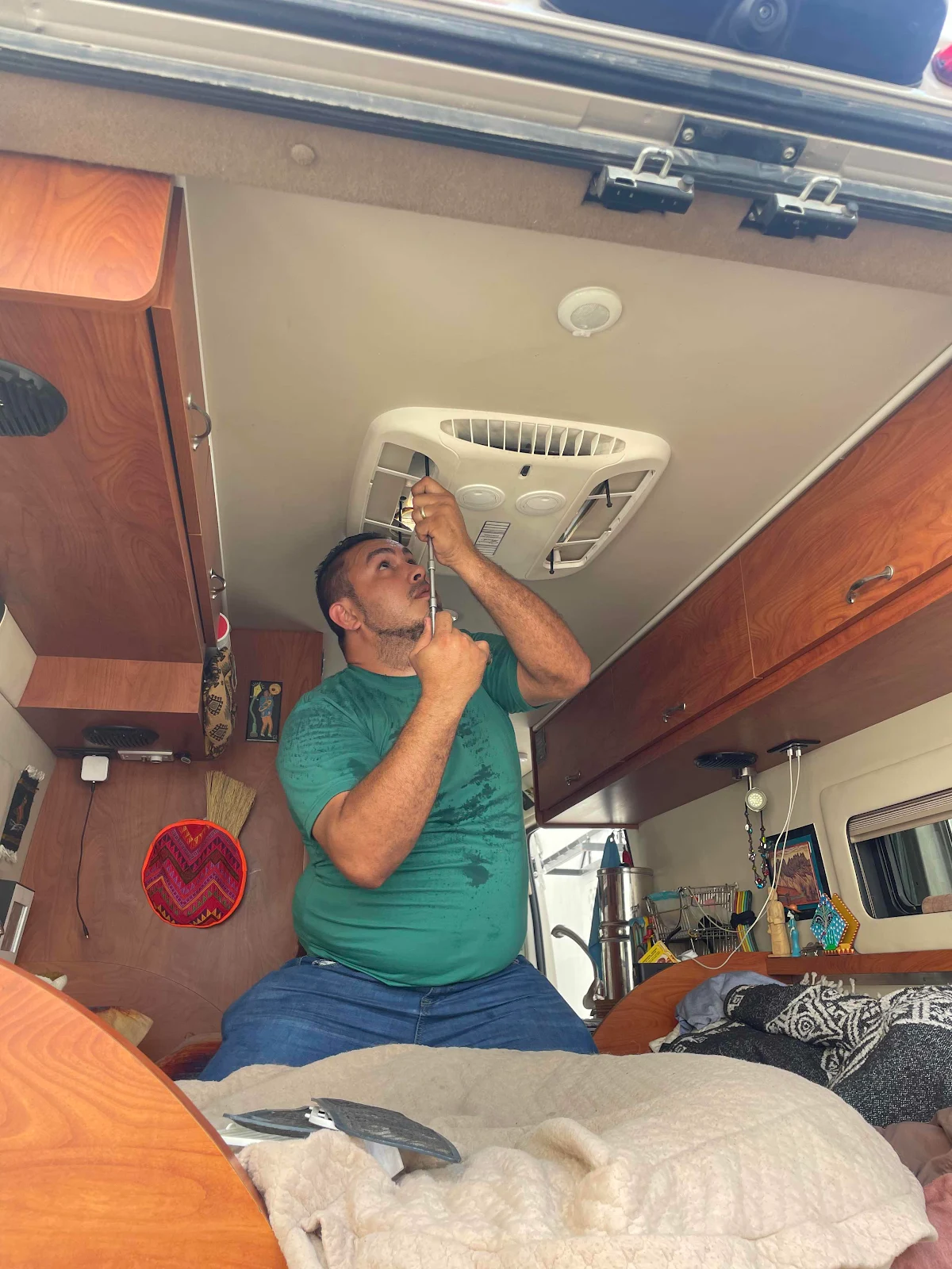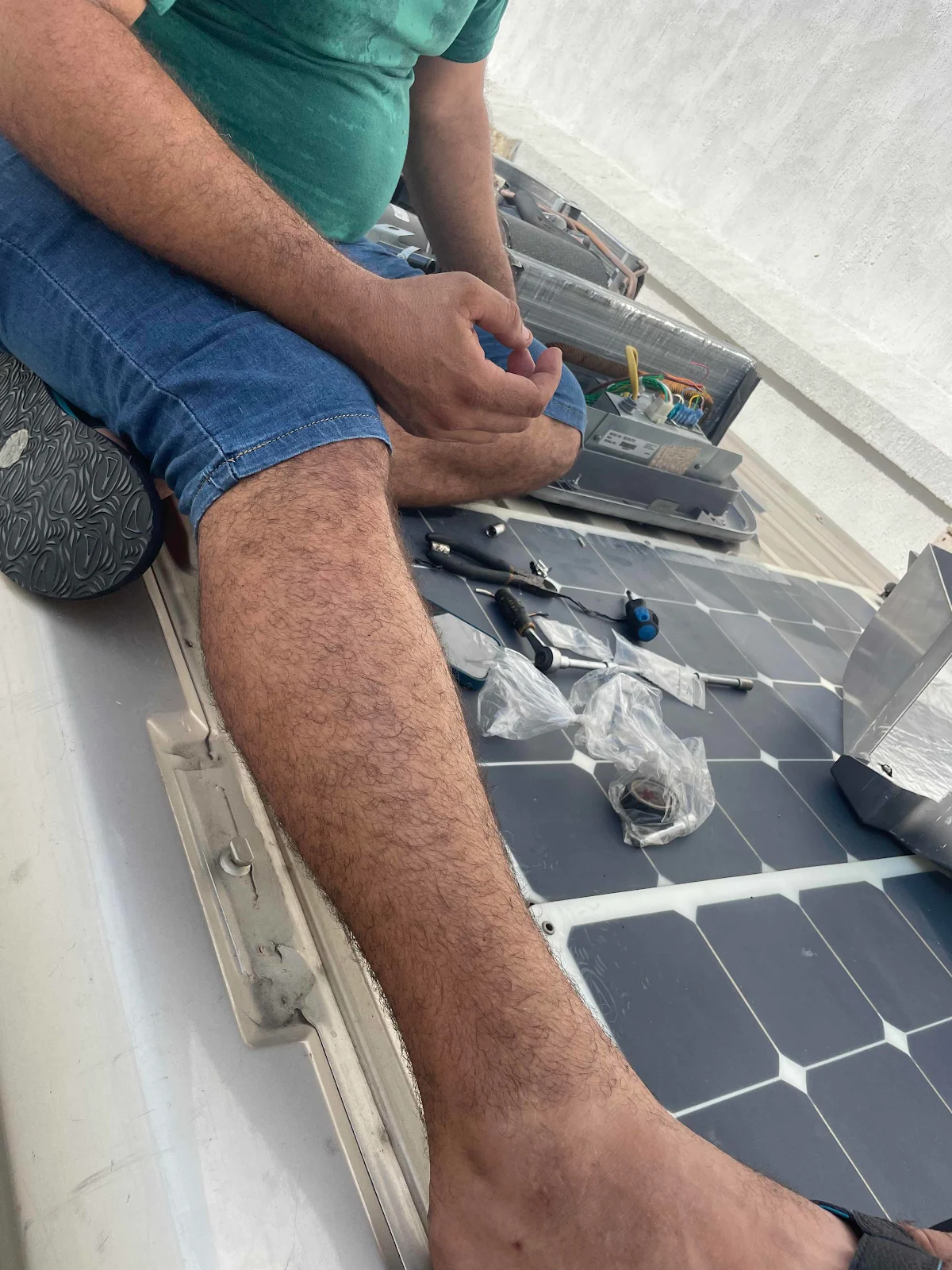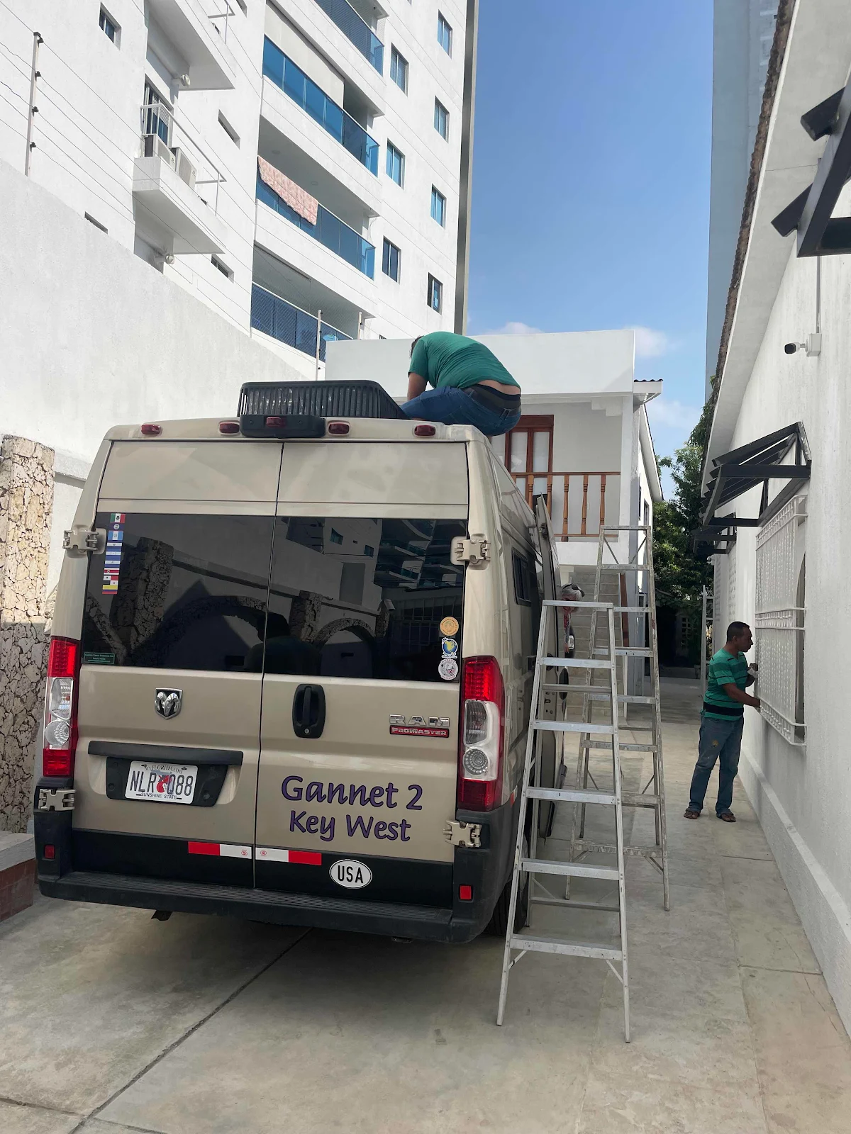 And that was that. He did it all on his own, slid it in place, wired it up and bolted it down. No new padding needed as the whole thing seems to fit in place. We kept his sheet of acrylic so next time we have what we need to plug the hole. I’ve learned a lot from watching him but I’m still going to hire some experienced truck a/c installer to check it out for me and muscle will be needed to lift it up and down. Ours now has new bearings and should be good for a while longer. Next time…I just cannot wait for our next container trip.