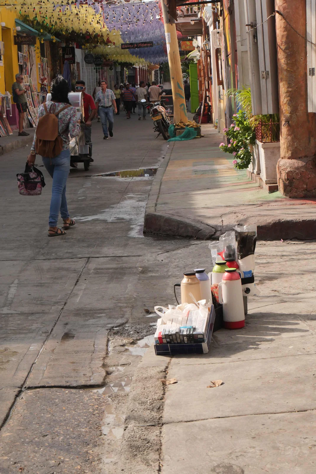 Coffee in Colombia is sold on the streets from thermos flasks, black and very sweet in small plastic cups.