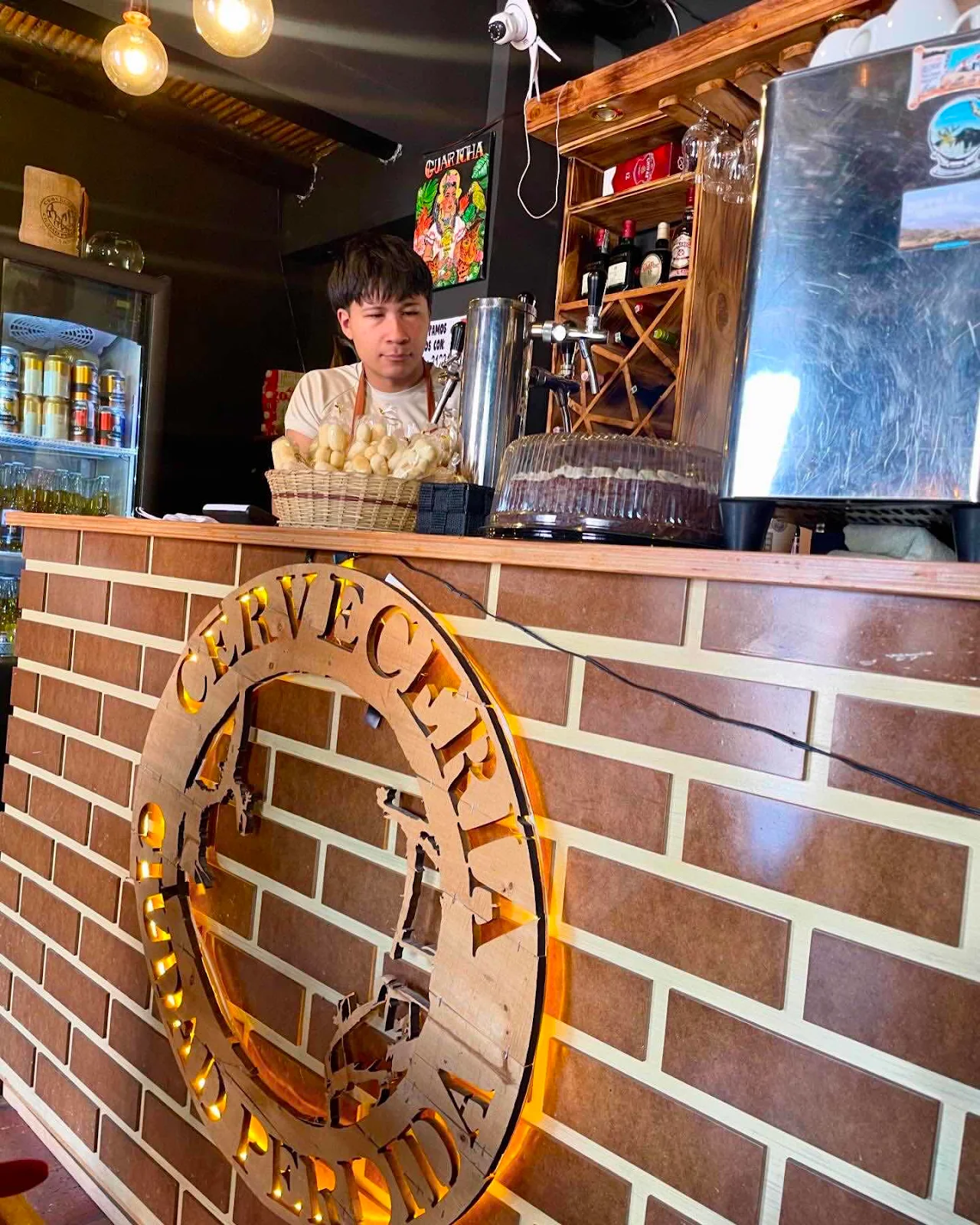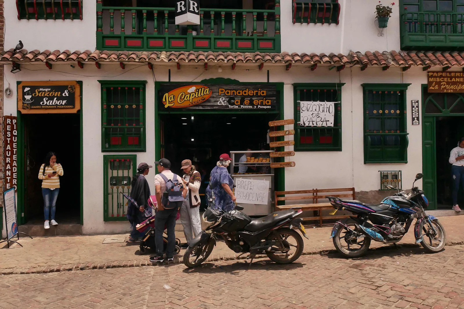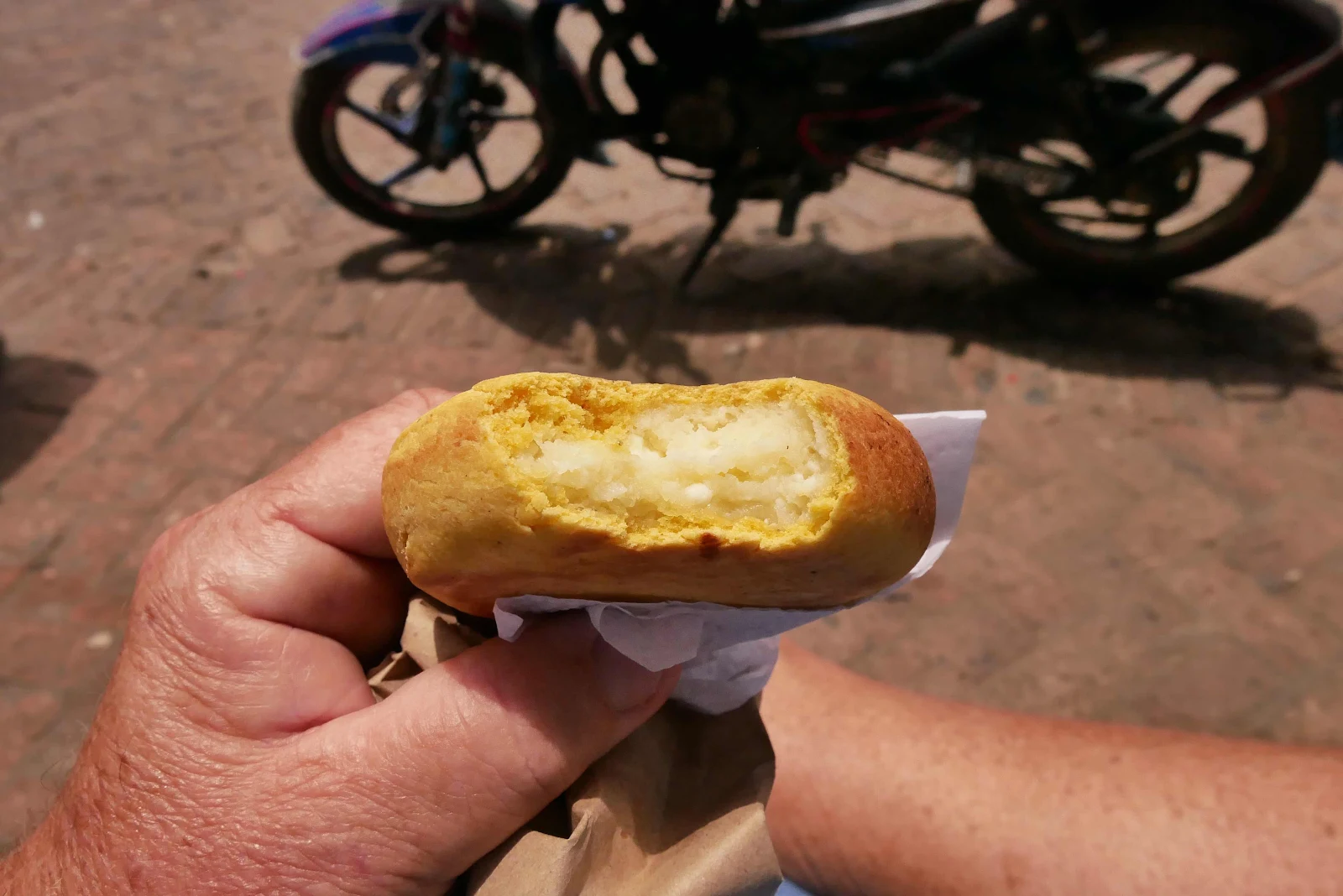 Despite the sign (above) urging people to let their hair down at the pub we limited ourselves to one and then went in search of a snack. The strange bready arepas of Boyacá were everywhere, filled with a mixture of cornmeal and cheese. They’re pretty good hot off the grill (for 50 cents each!) and Rusty couldn’t get enough of mine if you need his endorsement.