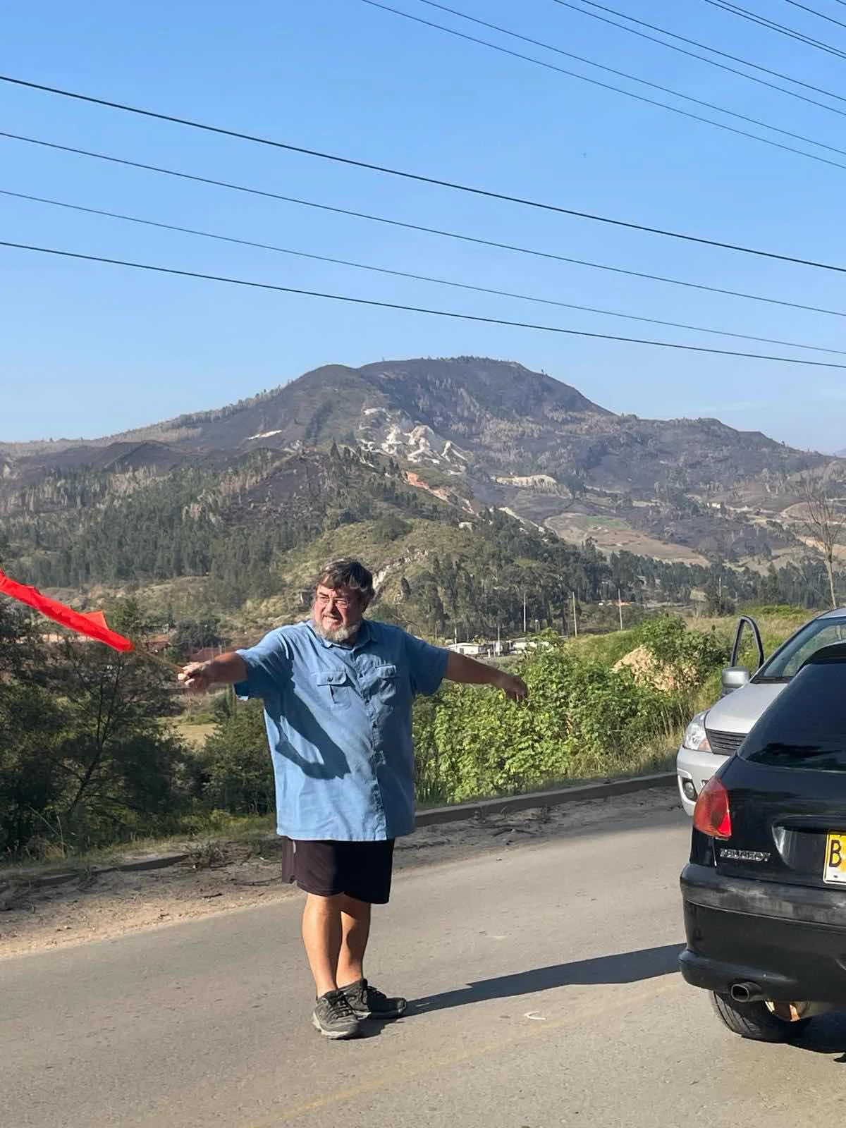 My wife took these pictures of the dispatcher (retired) doing traffic control somewhat unwillingly. We carry equipment required in Latin America, reflective vest, triangles, electric fusees and the huge red flag which isn’t actually required but has given useful service every time we come across an accident and that’s happened twice already before in Mexico. Finally I unsnarled the traffic much to my own surprise and the looky loos left. Thank god a doctor stopped to keep an eye on the patient who was awake with a smashed face and not much awareness of his surroundings, so we were free to go. So we did and no sign of police or ambulance after about half an hour of chaos.