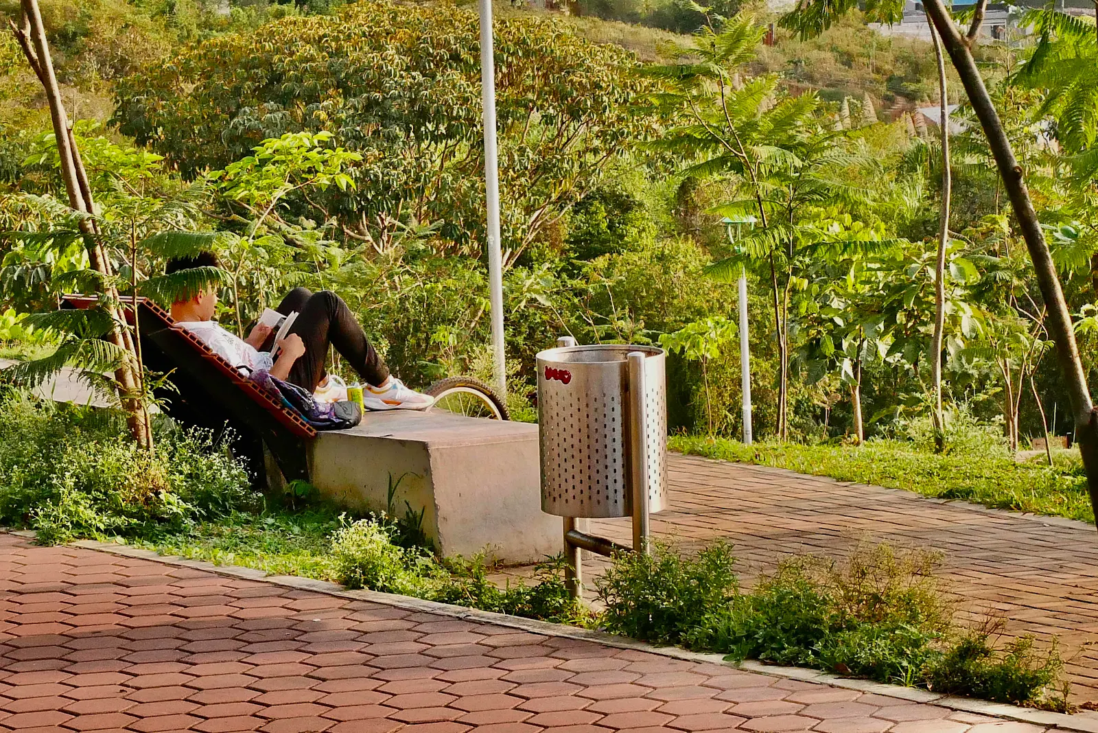 I like Bucamaranga, a city nicknamed the pretty (“lindo”) because it is famous in Colombia for its parks, the first thing a local will say if you mention the city. Above was our street camp Thursday night after we visited the Bosque del Lago del Cacique (woods of the chief’s lake) park: