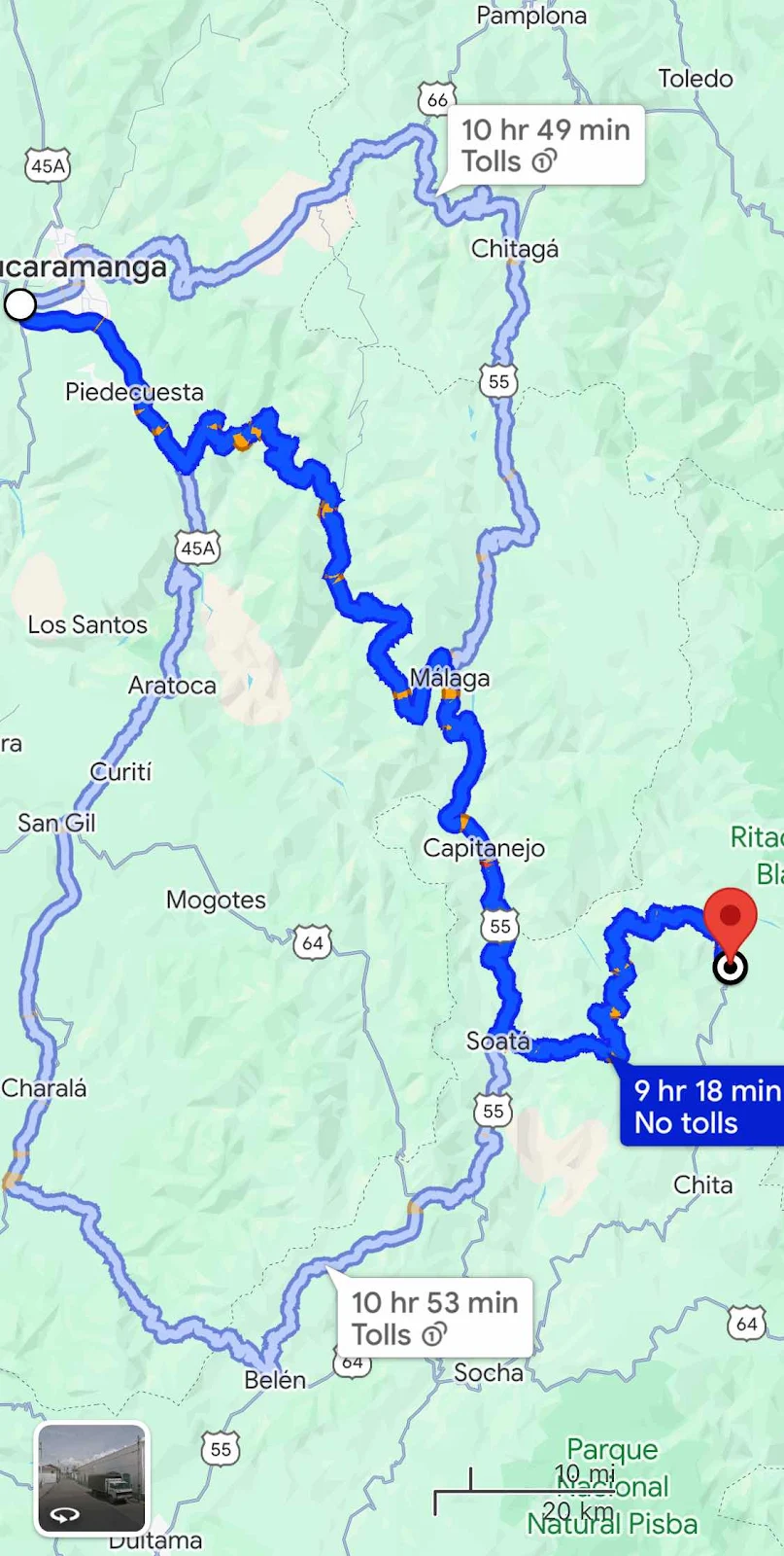 We faced a 200 mile drive to El Cocuy which Google estimated would take us ten hours and which we were figuring having come two hours and made no progress, might take us three days. Once there we could camp in a field at a hostel but unlike our Canadian friends we had no plans to hike 14 miles at 14,000 feet. They are lean and competitive where we are soft portly and enjoy comfort; I would be more inclined to rent a room with a fireplace than bust my lungs stumbling about above the tree line. Then after a few days of lounging in a frigid altitude adjustment we would face an equally long complex drive back down the mountains.