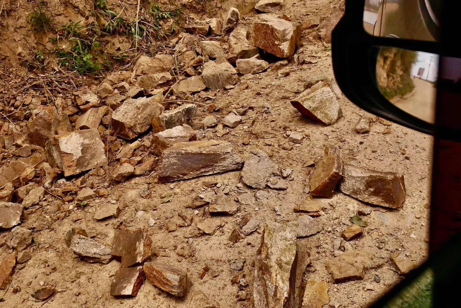 A recent huge landslide forced the construction of a temporary bridge over one gorge. One vehicle at a time the sign said. DO NOT STOP ON THE BRIDGE said another.