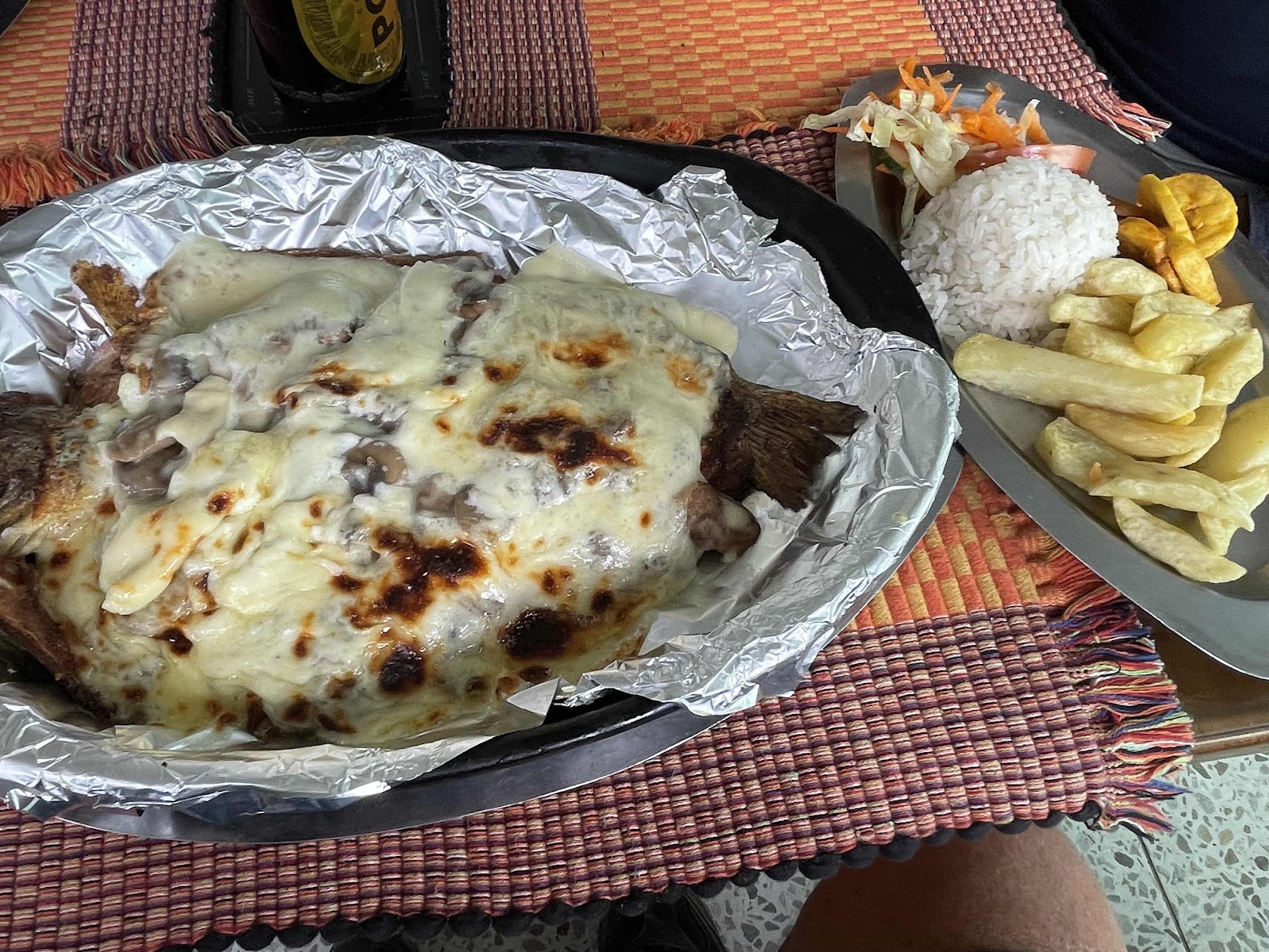 You know how the people in charge tell us cheese and fish don’t go together? I guess the message hasn’t reached Lake Tota in Colombia. My trout was covered in melted cheese and mushrooms! Never had that before. Layne’s trout was swimming in cheese and crisp sweet shrimp: