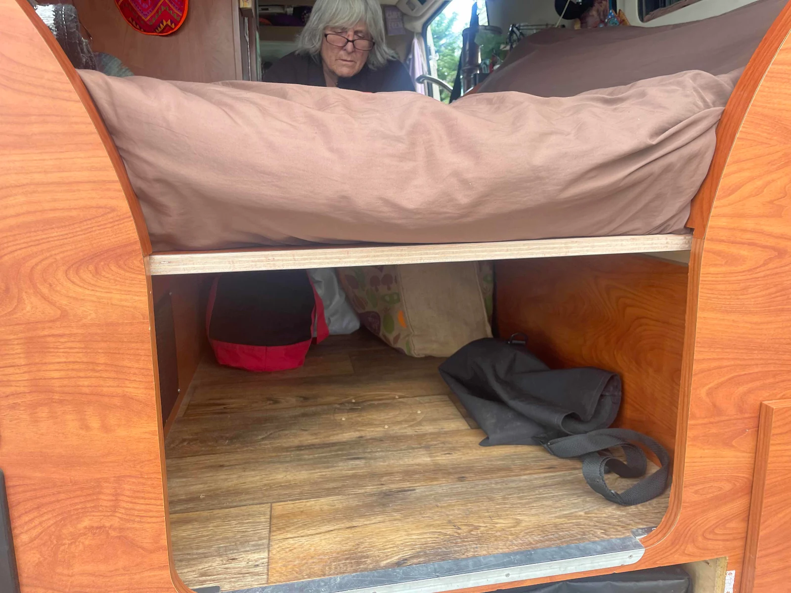First we had Jo-Jo (François) build a bed four inches higher to increase storage but that just did not work for me, and Rusty was put off jumping up onto a higher platform so we had the new bed fixed at our original height, damn the extra storage. However with none of the supports for the converting bed the space underneath still seems much larger and is decidedly easier to use with no beaches taking up space.