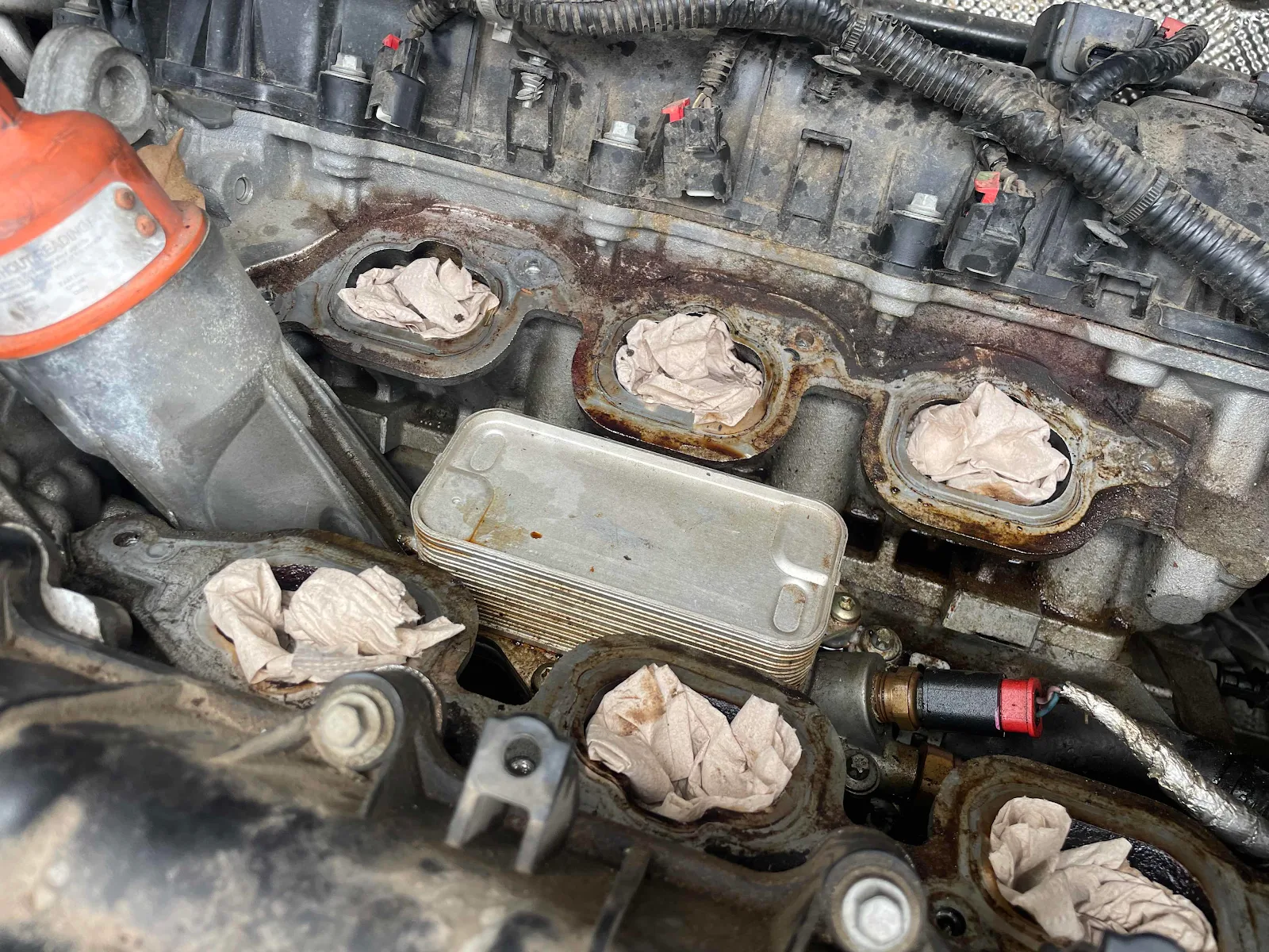 Why, one might ask is the engine apart? Well the answer is simple: there is an oil leak and it is coming from a funny little box that holds the oil filter. This box passes radiator fluid through it to cool the engine oil and it’s known to leak after tens of thousands of miles. And indeed the little silver box below is leaking oil.