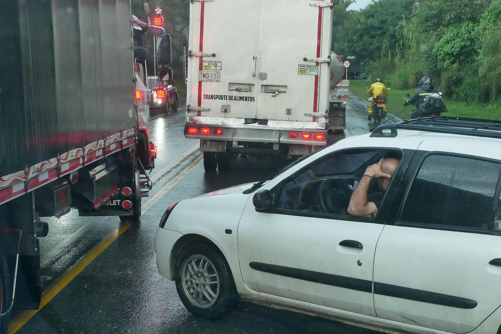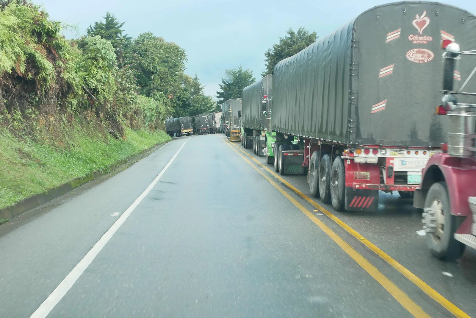 Fan-fucking-tastic. The usual Teutonic traffic discipline prevailed…NOT. I have no idea where they went but cars, small trucks and buses passed the stationary line taking cuts in a clump of chaos. Oncoming vehicles possibly tired of waiting came hurtling north back towards Cali. The snarls were epic. A tow truck who started out taking cuts all over the place gave up after he forced himself in front of us for a while and suddenly turned back.