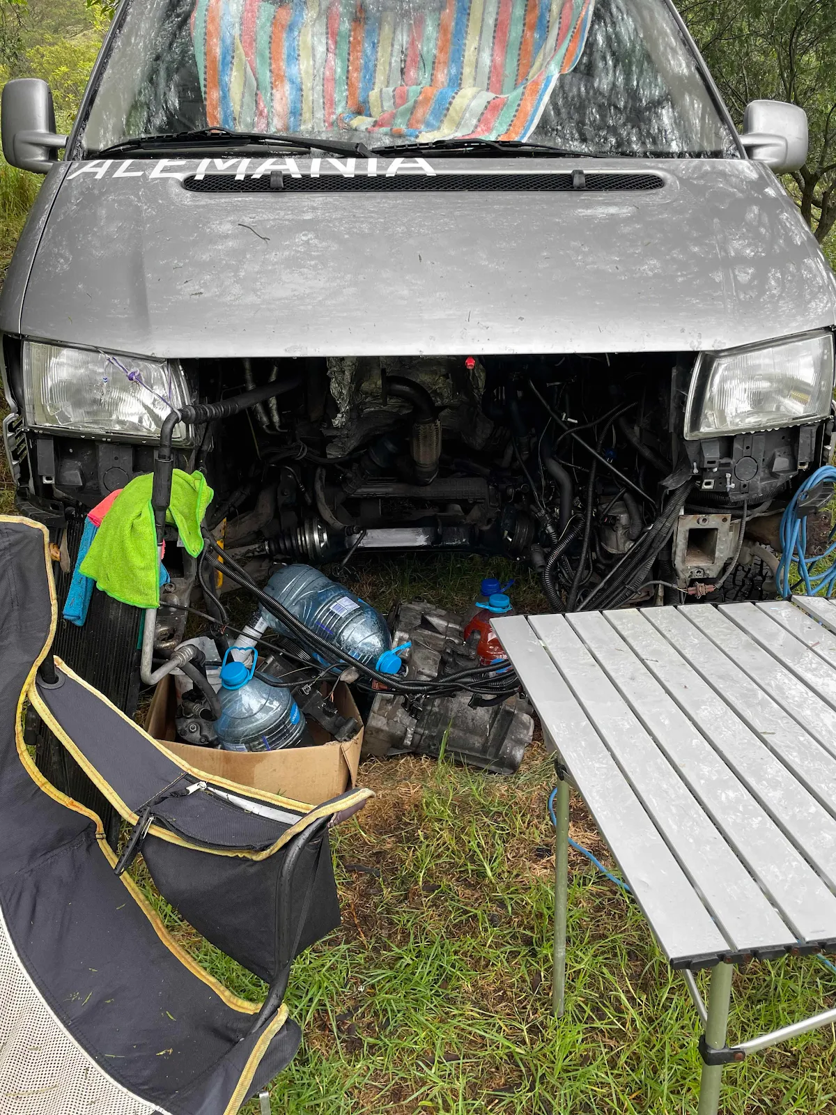 Florian the German mechanic who found our fuel hose problem has been living at this German campground for five weeks working for Hans the owner. His Volkswagen has no engine as the turbo charger broke and scattered metal into the engine wrecking it.