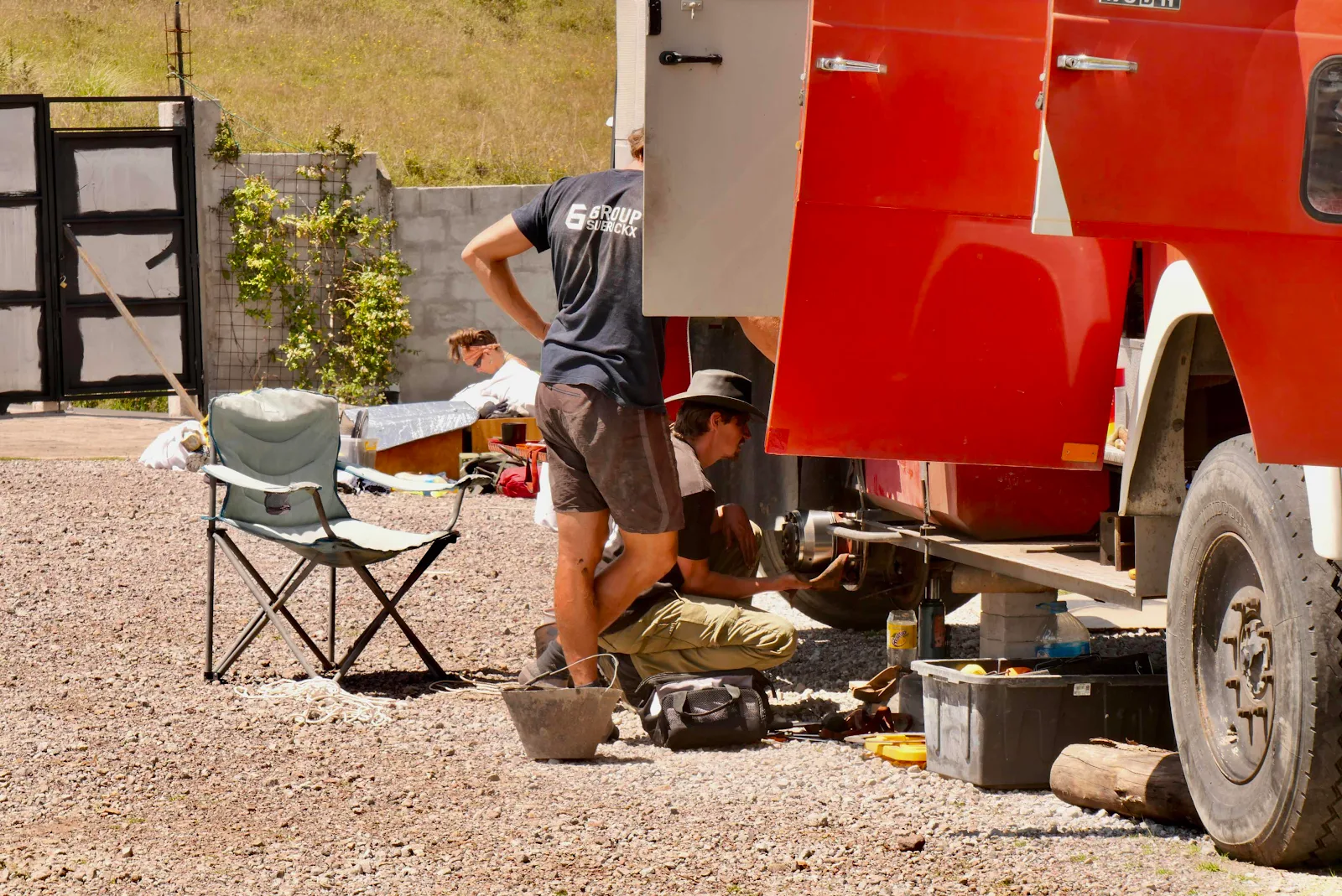 He and Jonas the Belgian are working to replace brake parts on the giant truck.