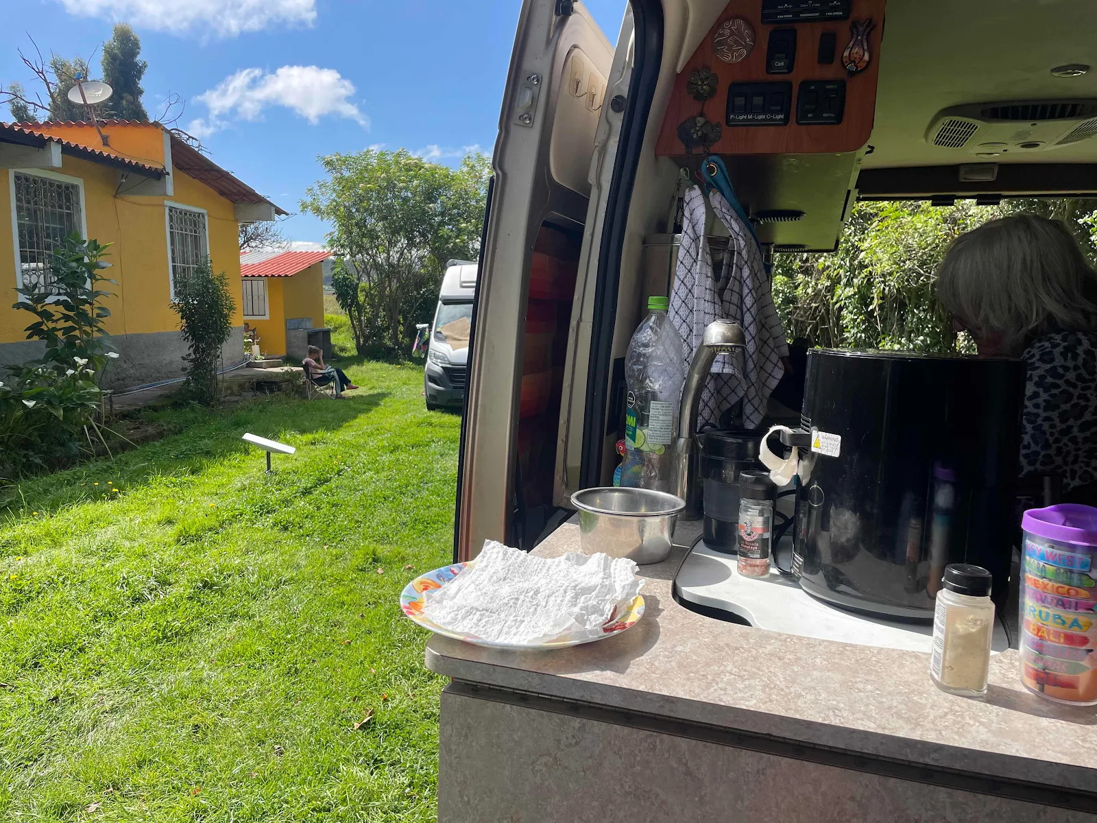 We were greeted by Caroline and Jan and their two kids, a Belgian family in a van traveling south like us. We’ve met them before and like them a lot so it was a joyous reunion as we were both feeling lonely. The campground has a lovely common area we could share and we were alone as the owner and his family were away.Suddenly the cold miserable world outside with its miserable dogs and despair was pushed back a bit. We talked by the fire, shared dinner and wine and a day of profound sadness gained a bright ending.