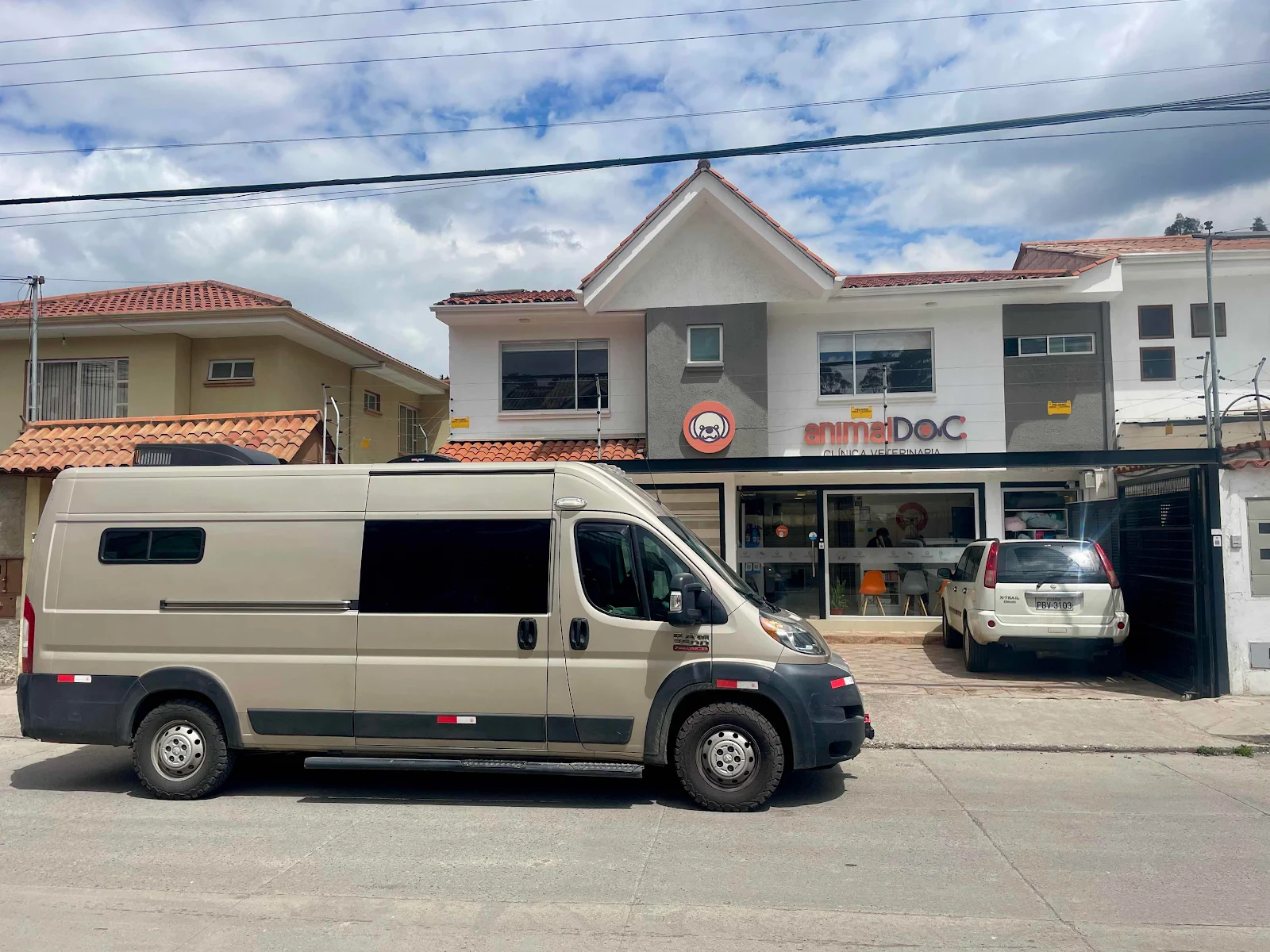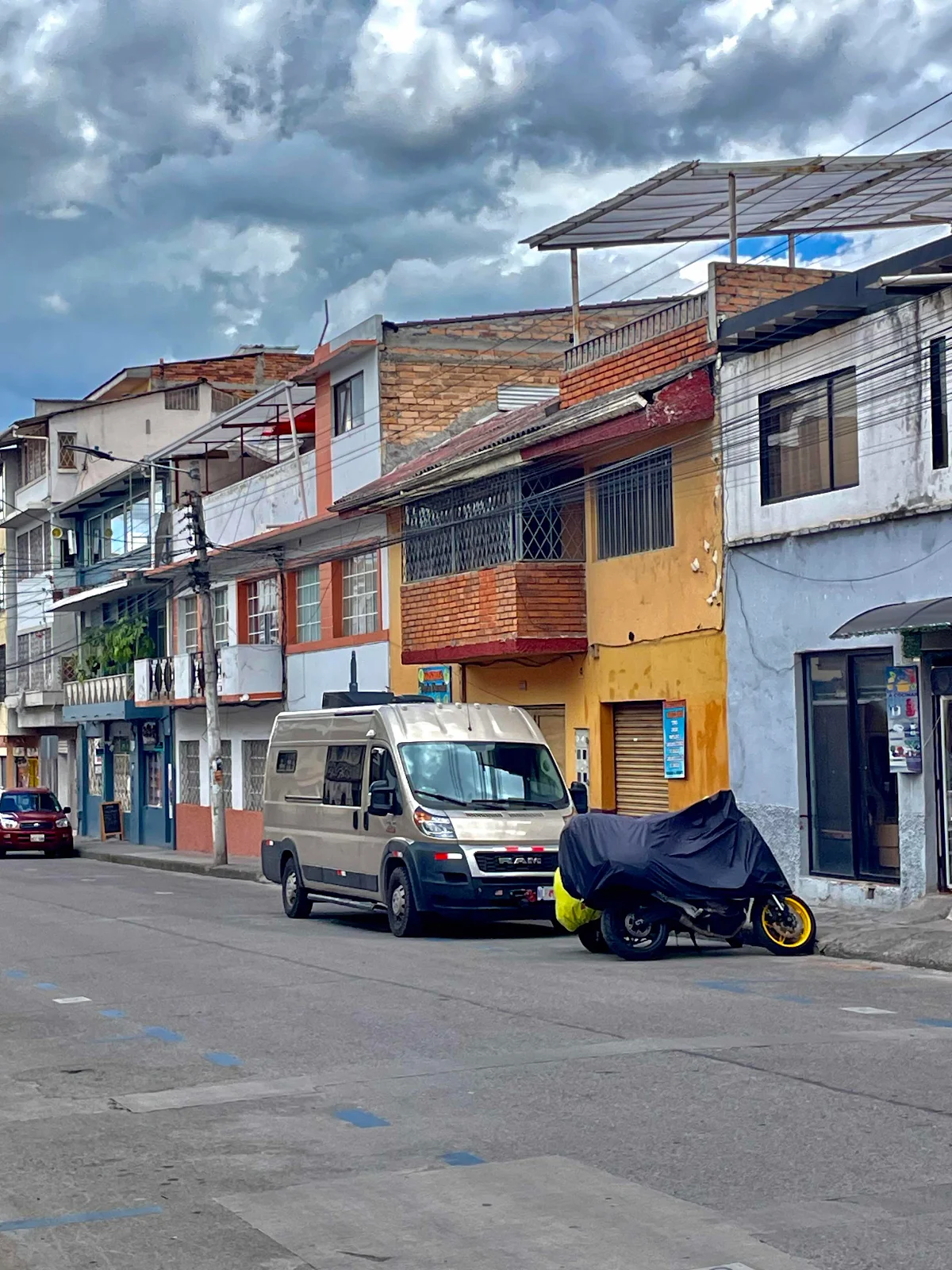 We had plans to rent an apartment for a few days in Cuenca to enjoy the historic city and ignore the rain. But first we spent one night in a campground listed in iOverlander with many positive reviews. Aside from the junked cars and abandoned projects lying around the owners have two aggressive German shepherds so we have to park with the big truck away from the shower and toilet.