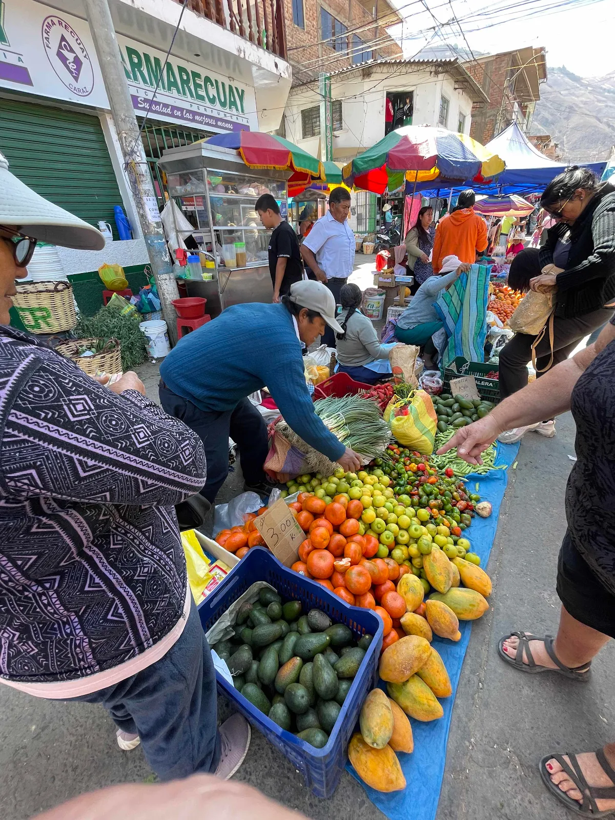 We wandered along buying fruits and vegetables here and there. Layne likes checking the quality at each stall though we don’t bargain as prices are so low it’s embarrassing. We got a giant bag of bread rolls for a buck. More avocados than you can eat for 75 cents and so forth.