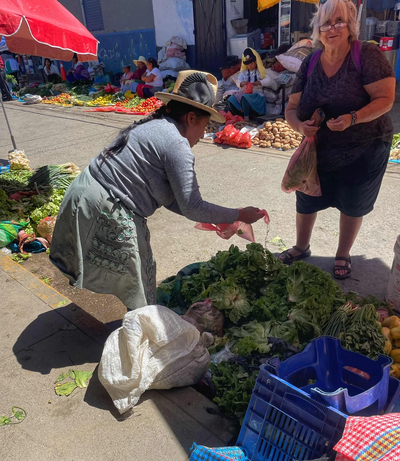 Layne bought some lettuce here where the stall holder is freshening her stock in the heat. The afternoon she washed everything she bought to make sure it’s clean for our delicate stomachs.