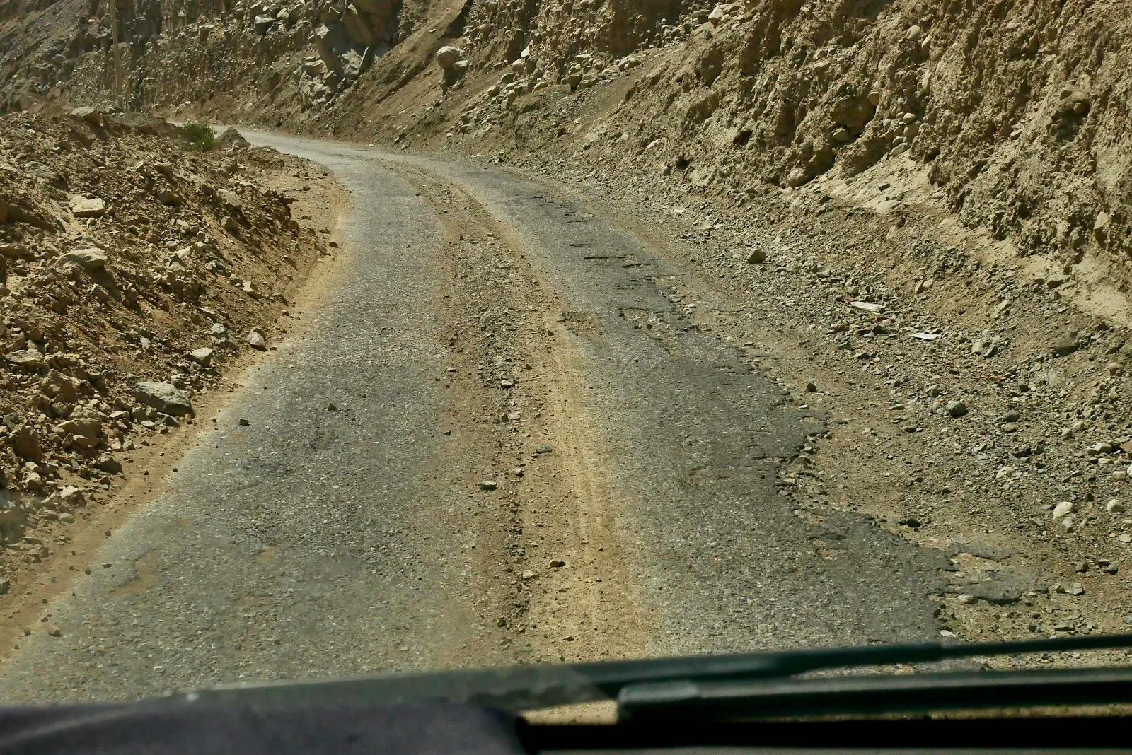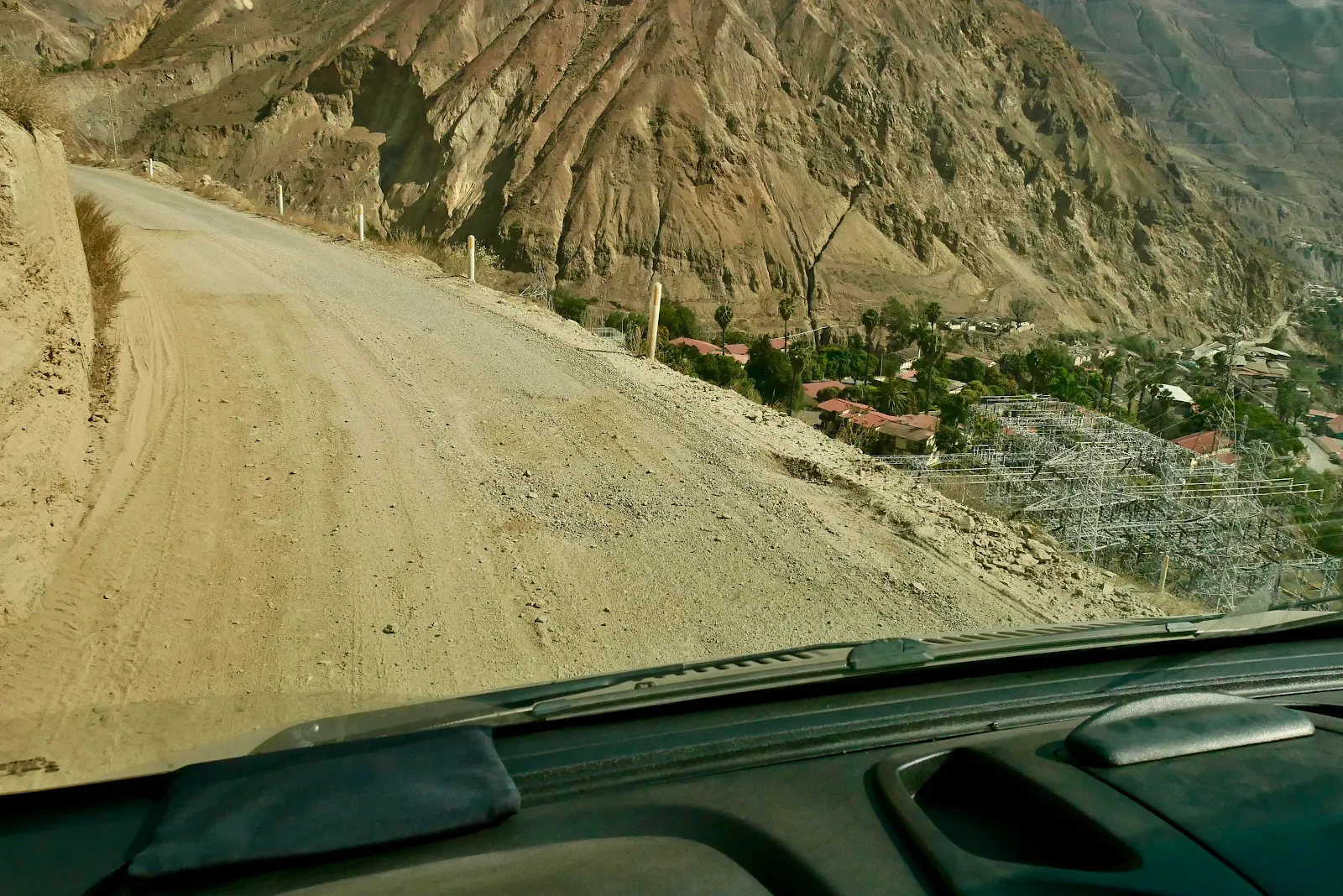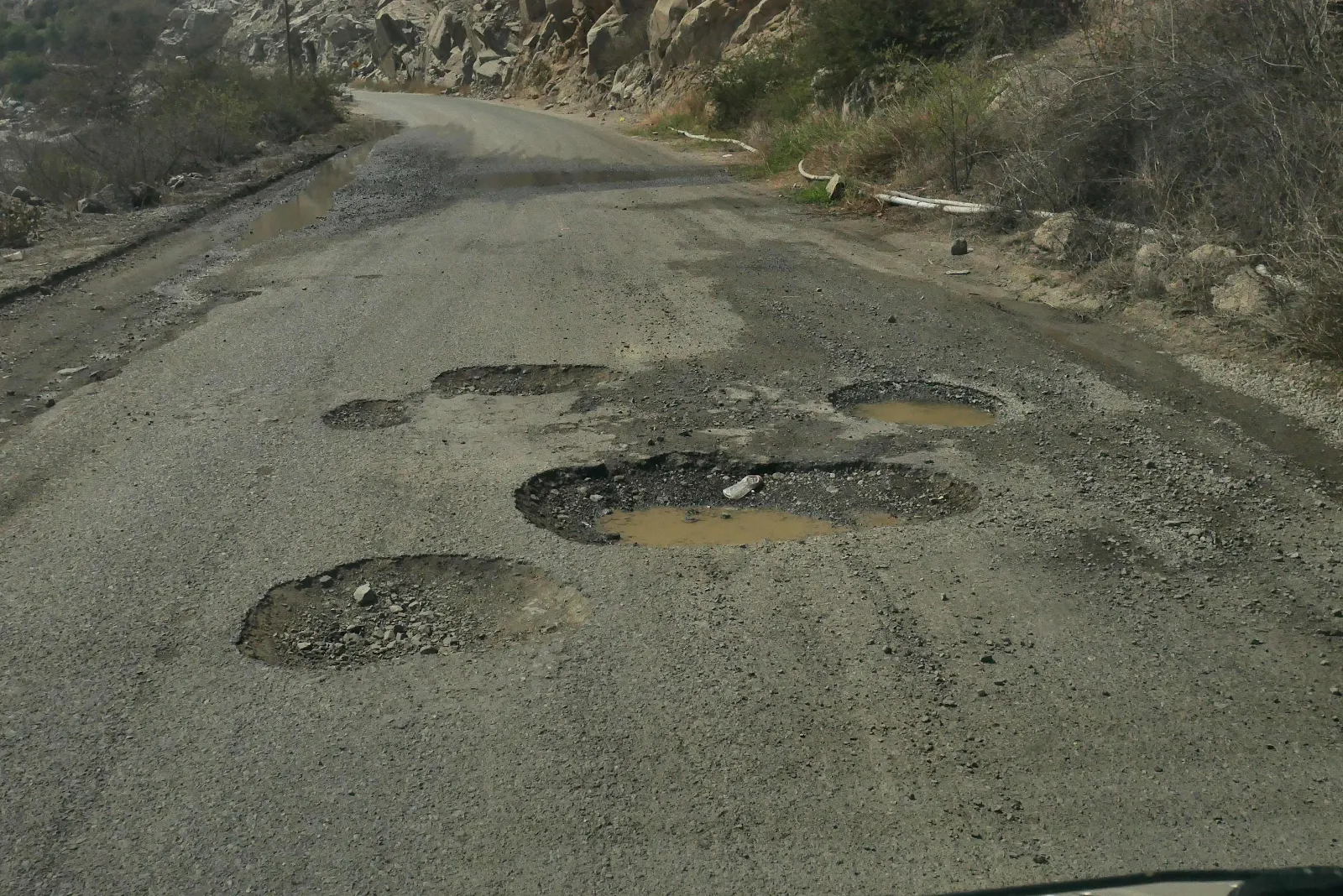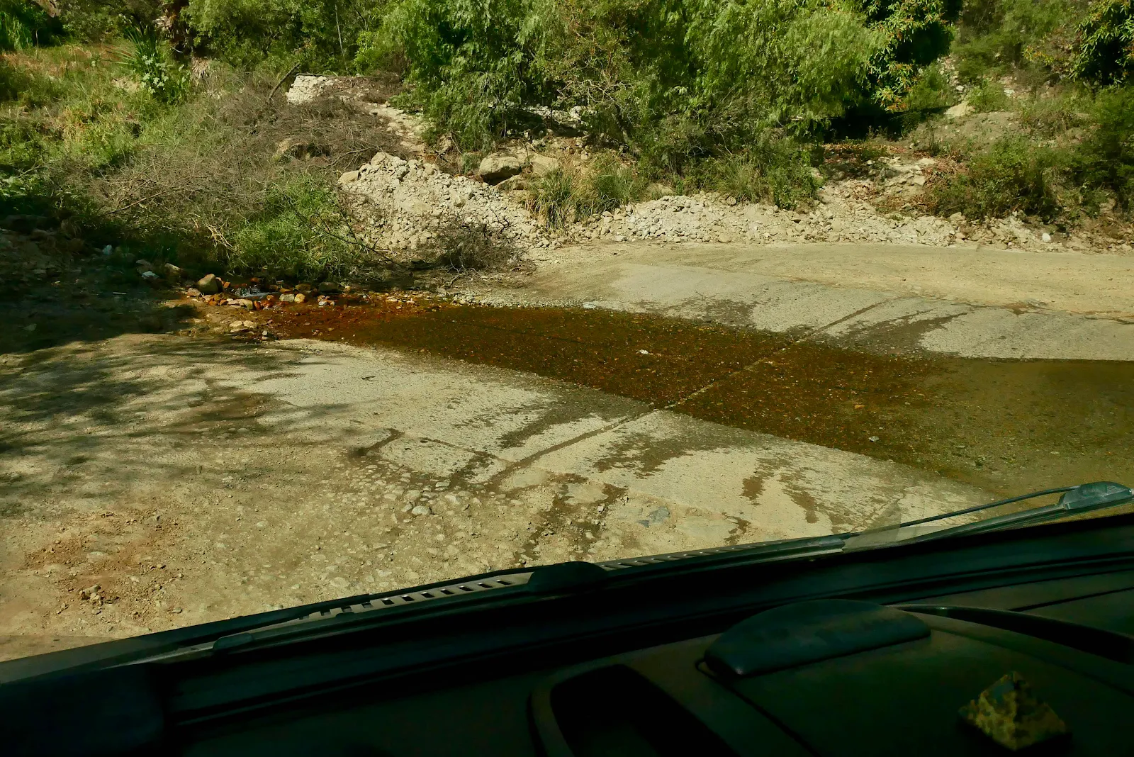 A giant wash with dans bulldozed to funnel water in rainy season. Everywhere there was a gully the road was washed out and left unrepaired. The deeper we went up the canyon the worse the washouts became and the greater the deterioration. Of the road surface.