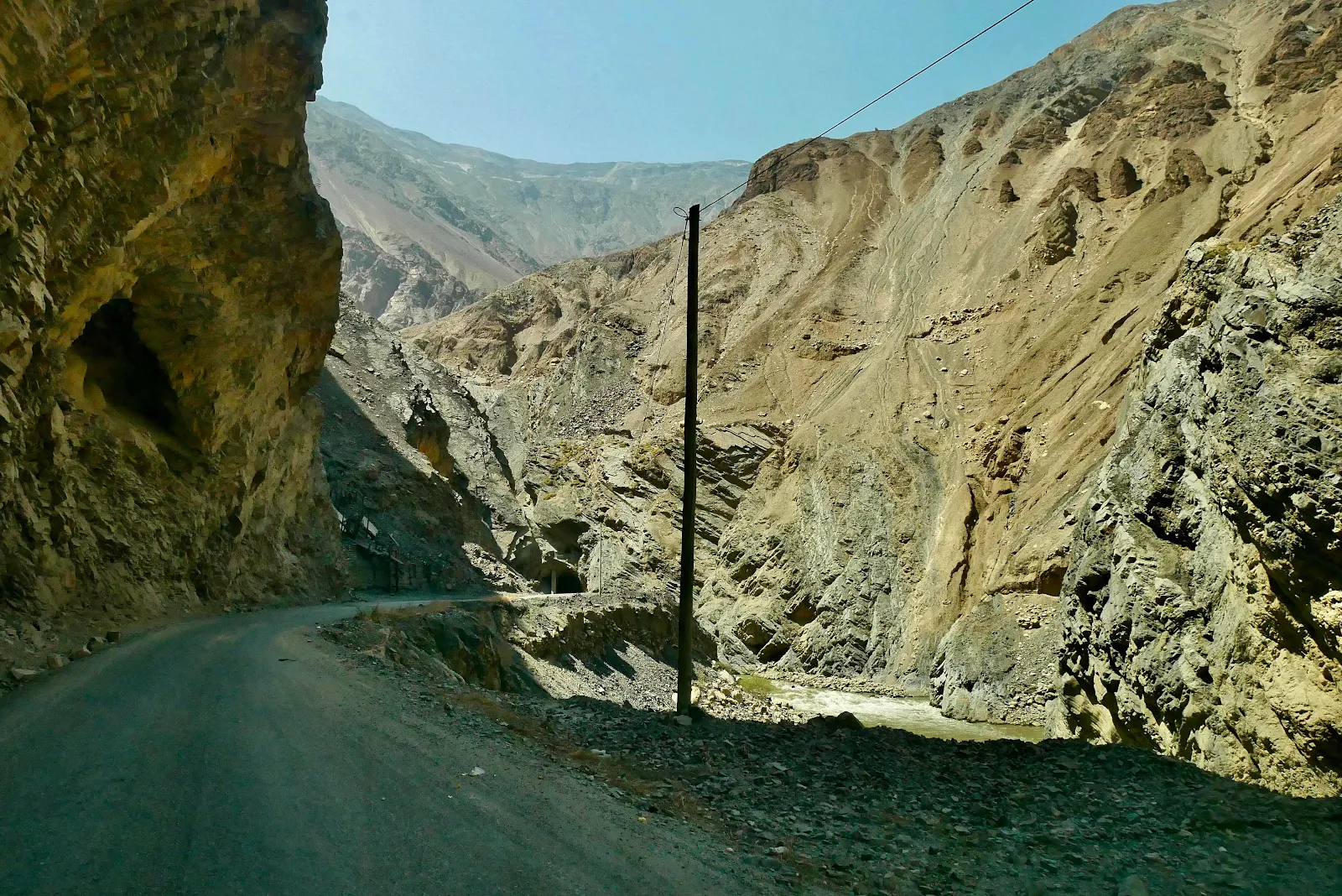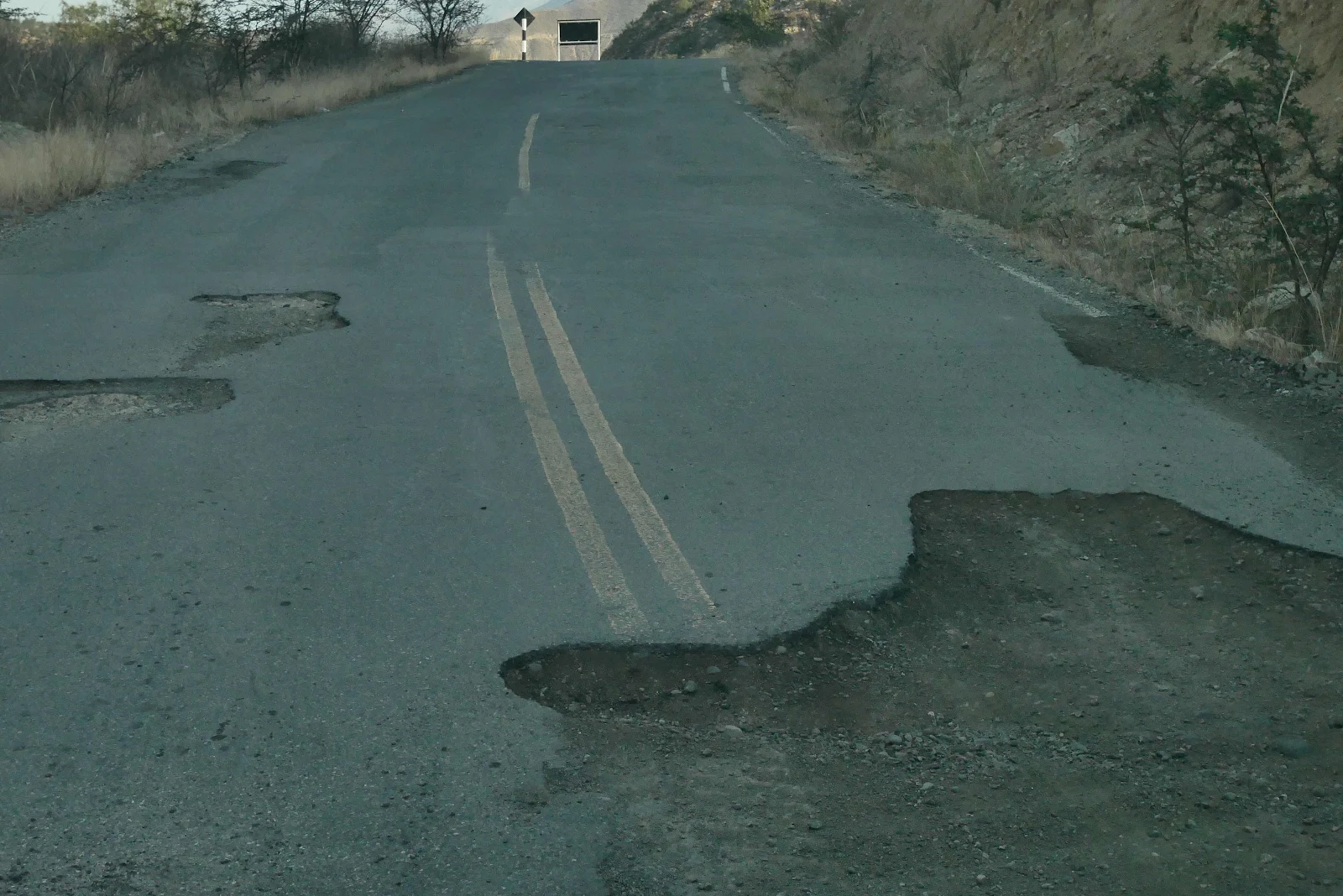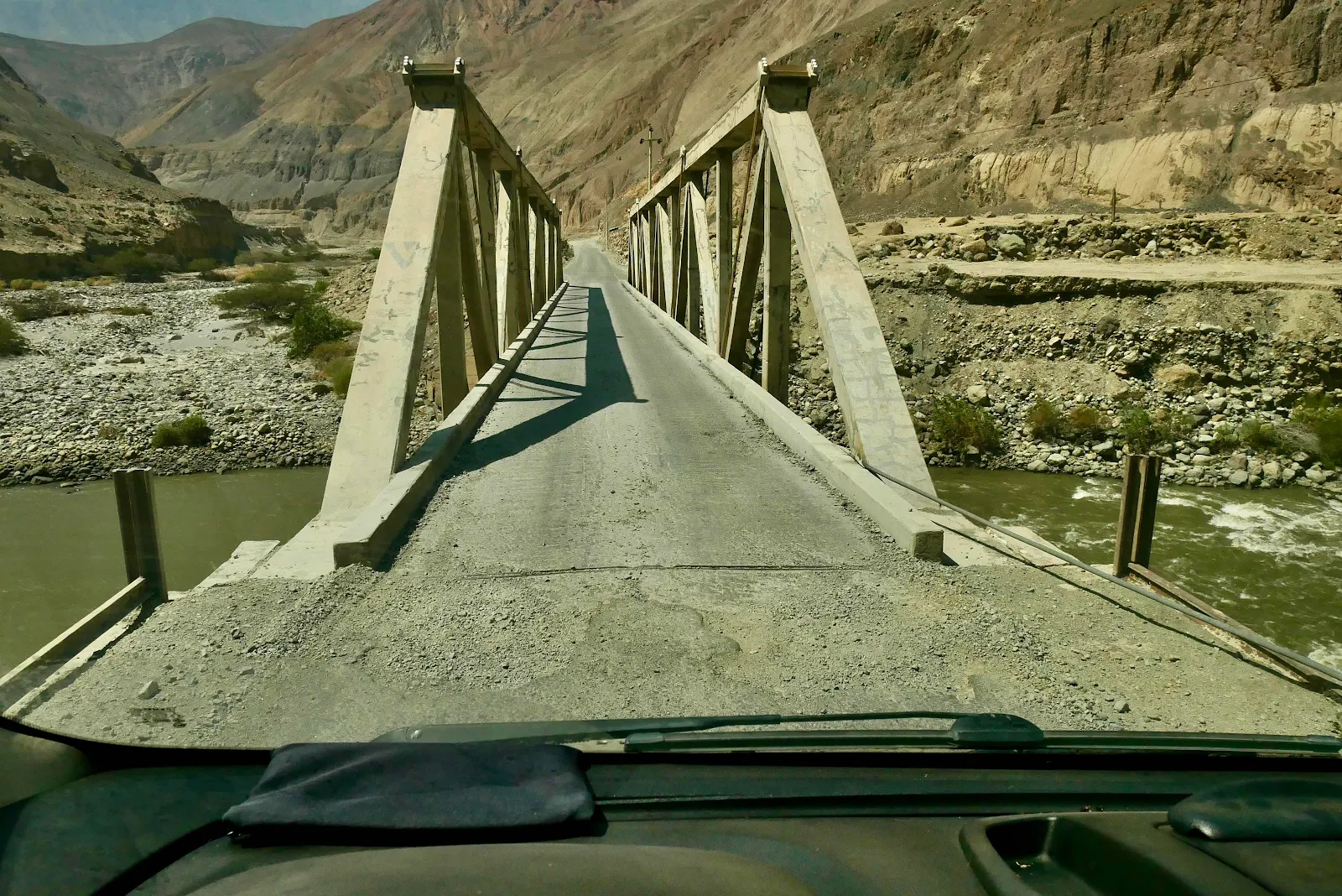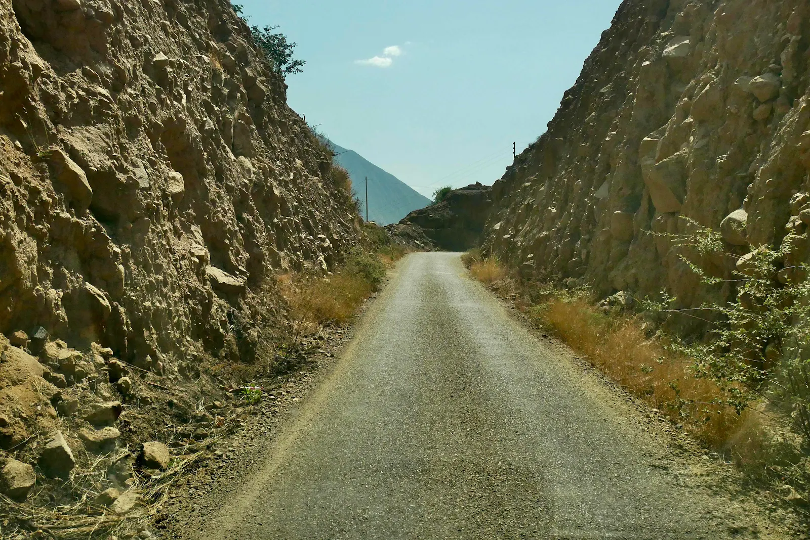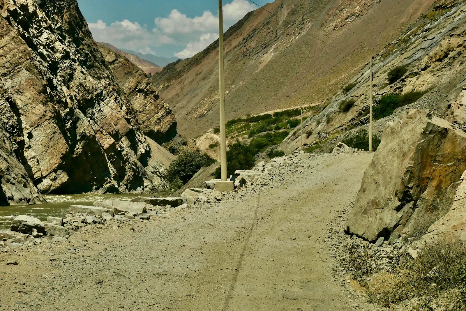 A giant wash with dans bulldozed to funnel water in rainy season. Everywhere there was a gully the road was washed out and left unrepaired. The deeper we went up the canyon the worse the washouts became and the greater the deterioration. Of the road surface.