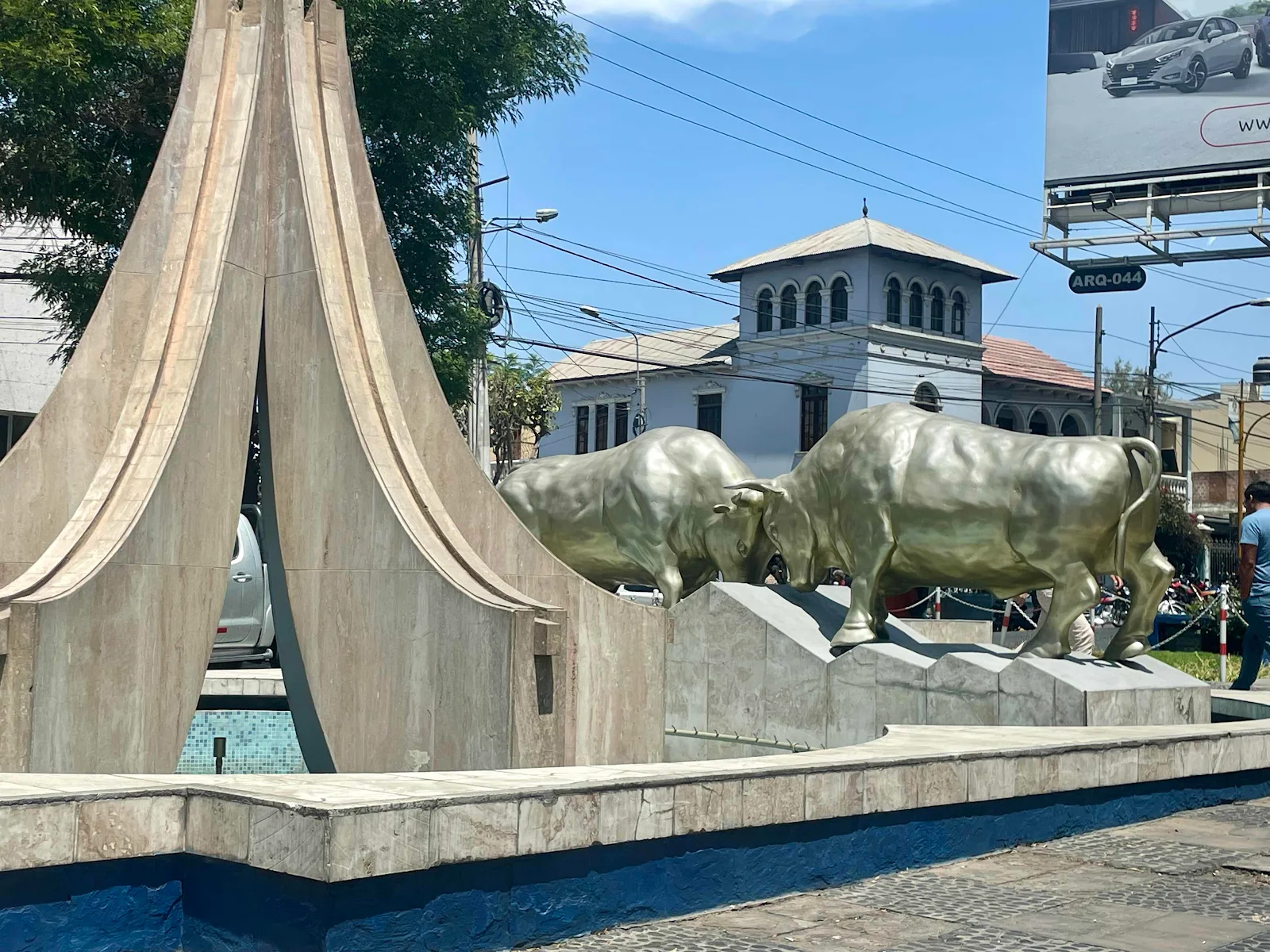 According to some online tourist photos, the sculpture refers to Peruvian bullfighting. Unlike Spanish bull fighting, in Peru, the bulls "fight" each other. Apparently there's a lot of huffing and circling and posturing; usually neither animal dies. Have no idea how they determine the winner.