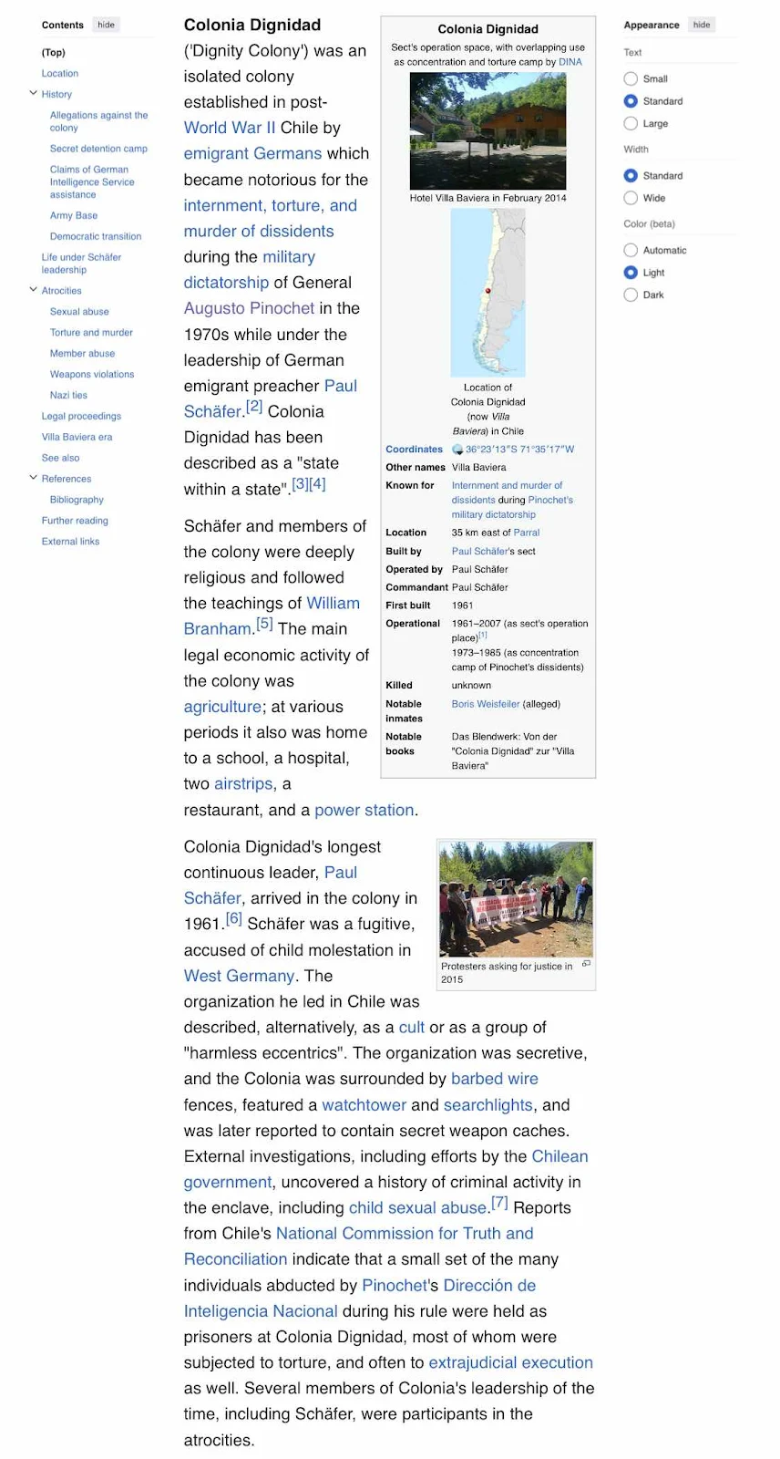 The location of the colony is in a deep valley at the end of the road with a clear view of the Andes on the eastern horizon. It’s founder, a former Nazi himself, came here to escape child molestation charges in West Germany in 1961 and he brought 70 followers with him. The rumor is they included some former Nazis and the colonists used secret contacts to get special privileges in their new country of residence. That help came from the Chilean generals they later helped openly after the 1973 coup. It was a sordid start.