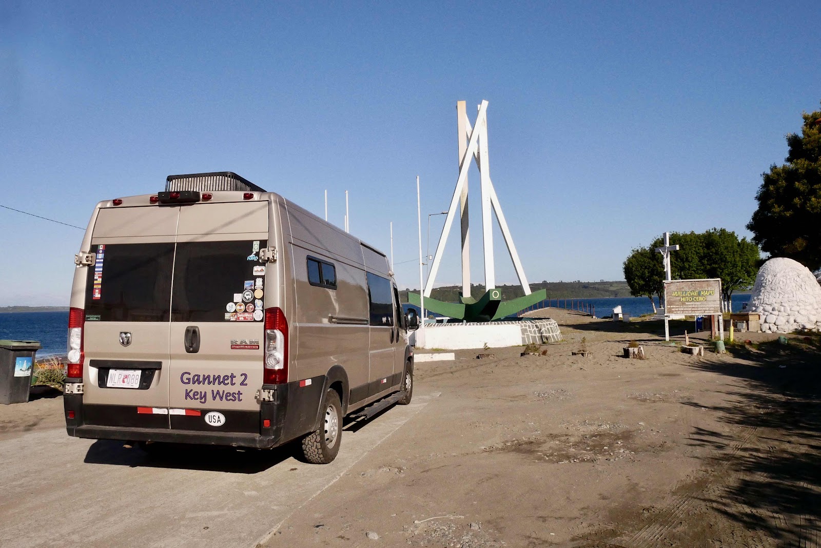 43 Degrees South Latitude, 150 miles south of Puerto Montt in the town of Quellón at the southern end of Isla Chiloé. And there you have it precisely. 16,000 miles and 14 months from our border crossing in Laredo Texas and here we are.