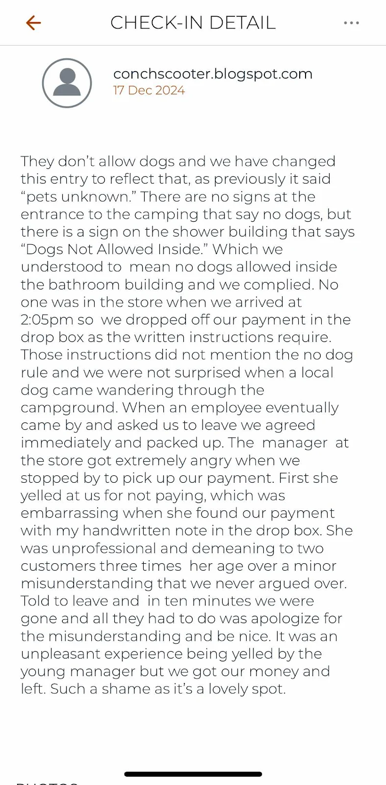 Okay I said, we’ll pack up but it’s a pity you don’t mention this policy anywhere. She pointed to the sign outside the shower “Pets May Not Enter.” I’ve seen those signs in many campgrounds where pets aren’t allowed inside buildings.