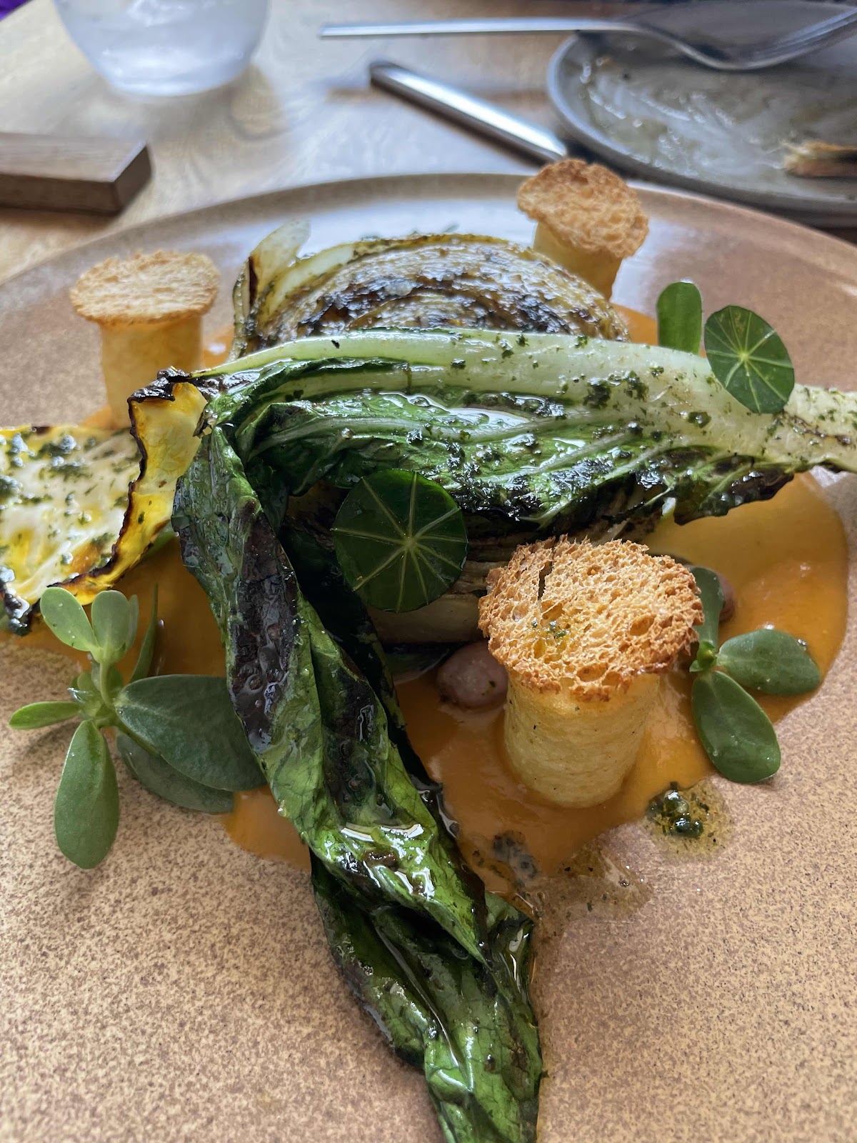 We shared a main course of grilled yota, a vegetable unknown to me. It tasted like slightly sweet pasta served with beans and water cress and potato pieces topped with discs of toast. It was all designed to highlight local products.