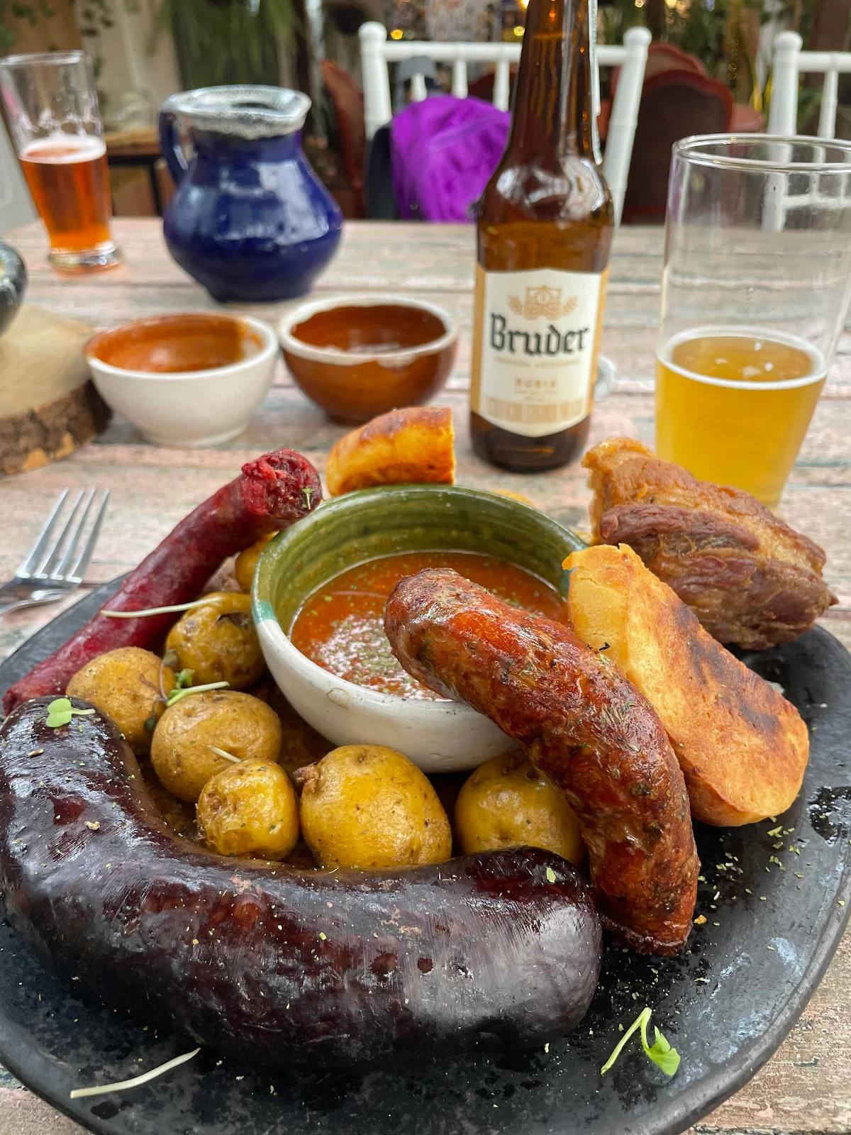 One last overwrought lunch with left overs for days was in the plans at Happy Monkey. I got the sausage plate which included the big black pudding. I tasted several pieces thus confirming I do not like the taste nor the texture of cooked blood. During my travels I find rich people eat expensive cuts of meat because they taste better and cooked blood is basically inexpensive nutrition as poor people use every part of the animal which is laudable but…And that certainty opens the door to endless disagreements with connoisseurs who accuse me of not being an adventurous eater; I know my limitations and in my defense I grew up wealthy so I suppose I developed snobby tastes and I’m sorry. I promise I will at least try some guinea pig in Ecuador but I expect the same results. Rusty got the huge black sausage for dinner and loved it proving once again he has better taste than I.