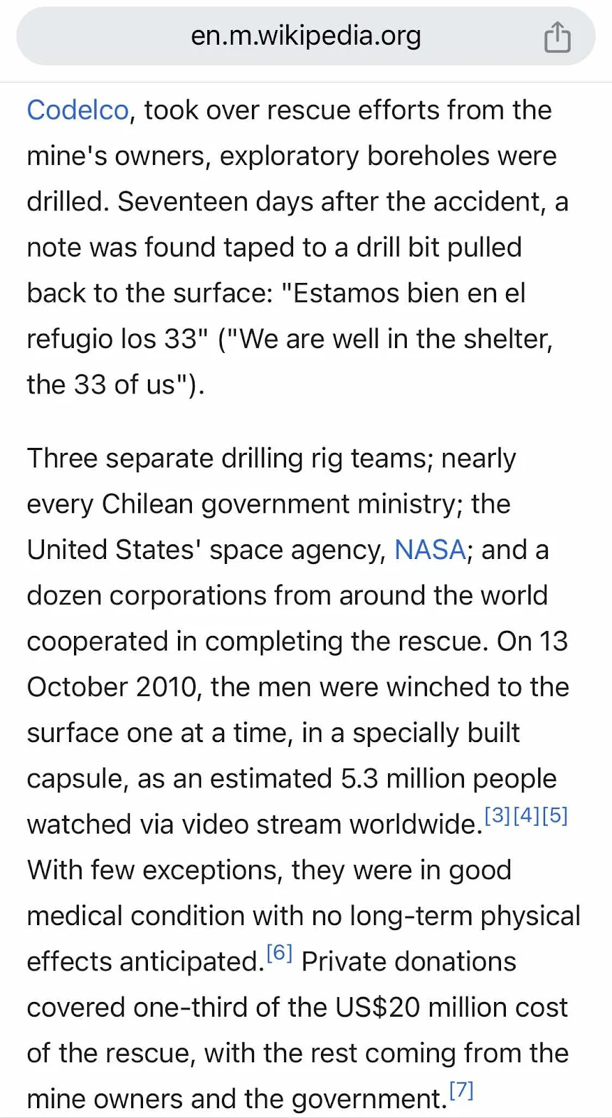 The rescuers dug a shaft to the trapped miners and sent them air and supplies. That took 17 days to accomplish.
