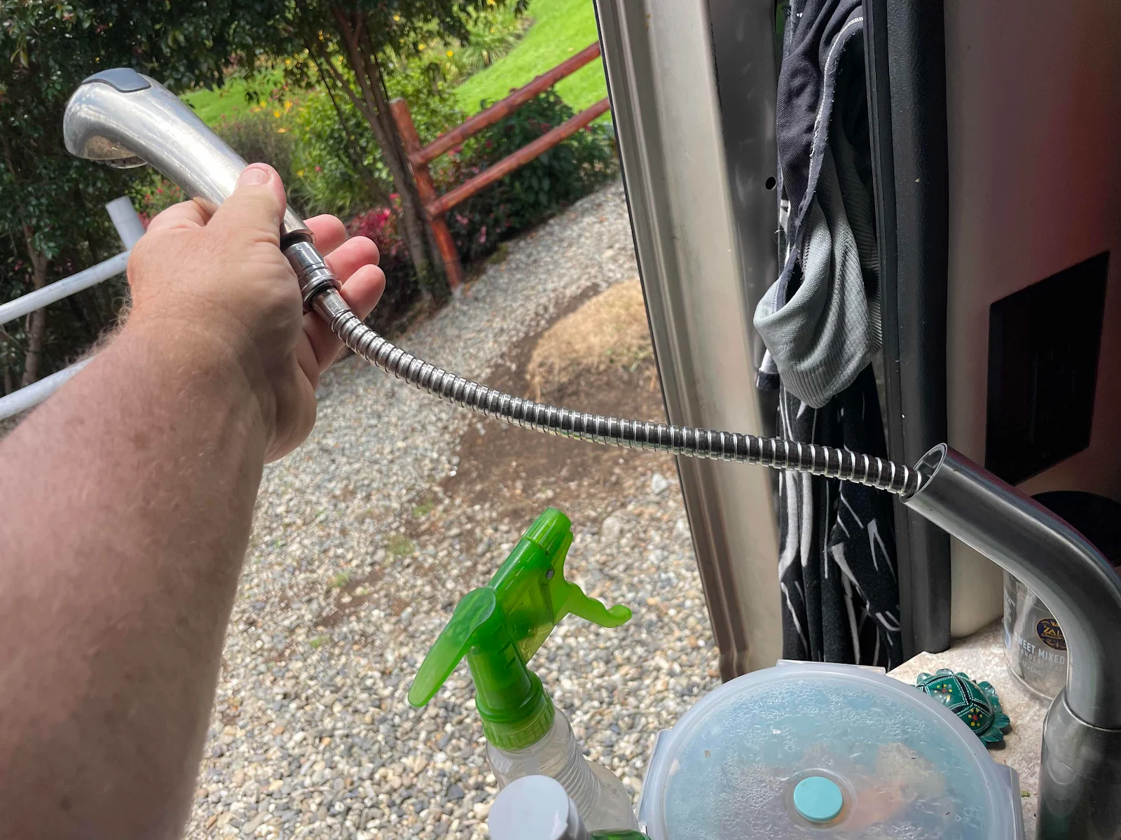 The faucet doubles as an outdoor shower. We also have a solar shower which will heat water if left in the sun. We use that mostly in the US when wild camping. In Latin America we rarely wild camp as there isn’t much public land and the custom of sleeping in your vehicle is not yet common in the countries we have traveled. We have heard Chile and Argentina may well be different so we look forward to that. Campgrounds fortunately aren’t expensive here and some have hot showers.