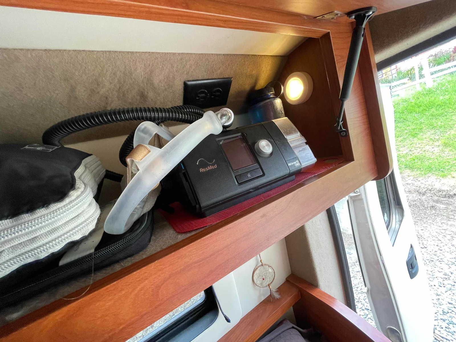 After my motorcycle accident in 2018 the doctors said I needed a CPAP after they watched me sleep during my three months in the hospital. I asked Custom Coach to put a 110 volt plug above my pillow and there it rides. I find it indispensable to a good nights sleep (or a nap) enough that we carry a spare in case this five year old machine should die.