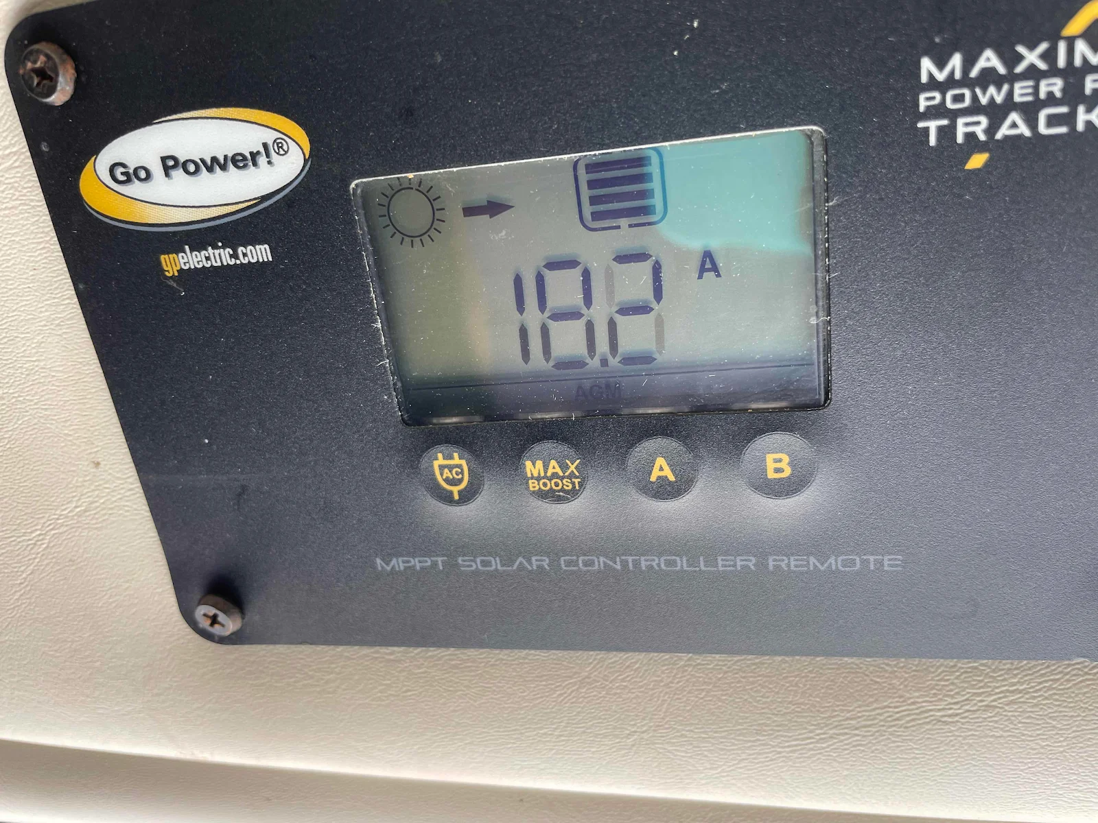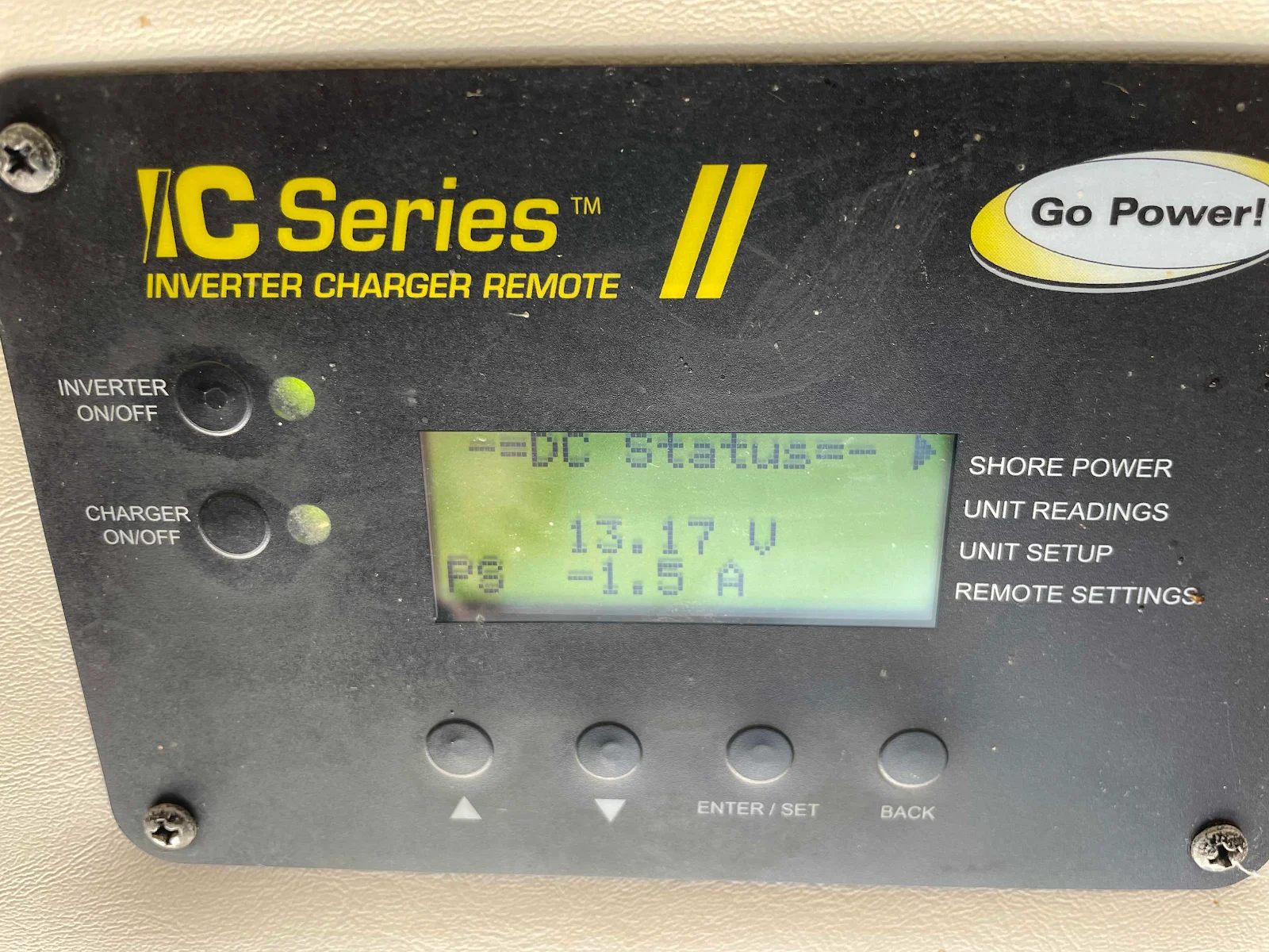 This is the box that monitors our inverter and our shorepower charging. Our batteries are fully charged at 13.3 volts more or less and discharged at 11.5. After three years I can tell when we need to worry about low batteries. A simple fuel gauge would be better but this is what we got.