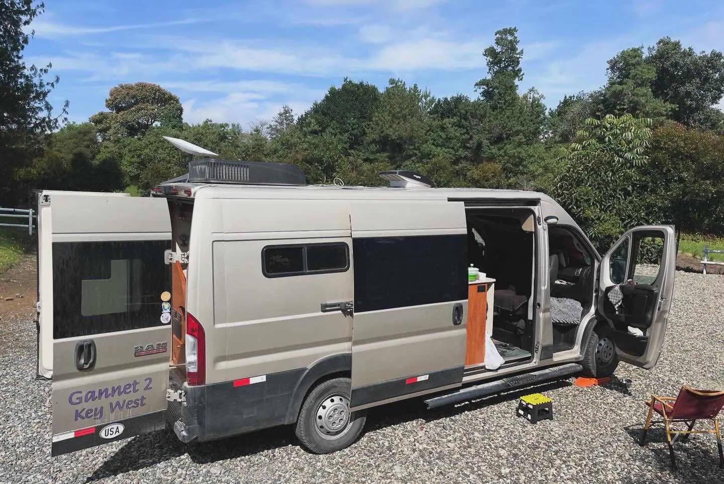 GANNET2 is a 2020 Promaster 3500Ext bought and built for us by Custom Coach Creations in Deland, North Florida. Layne designed the interior with Bob the owner of Custom Coach and his staff in late 2019 and the total cost came to $92,000 including taxes and registration split pretty evenly between build and the cost of the van.