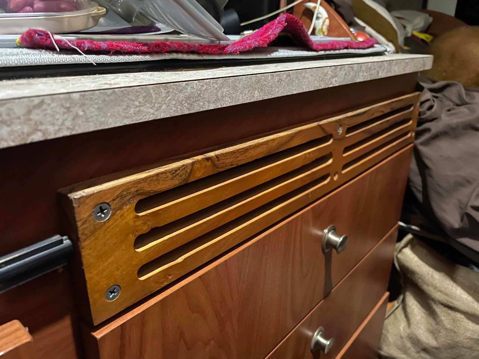 The stove had a tendency to overheat, a problem solved in Panama by Sergio the electrician who built some ventilation for us. He removed the cutting board to allow air to circulate under the stove which solved that issue: