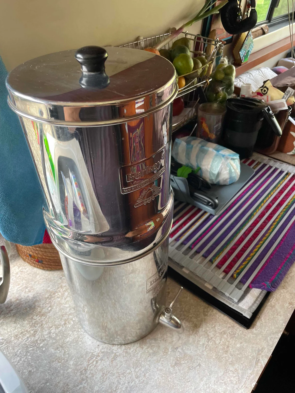 Our Berkey one gallon filter. We put all our drinking water through the Berkey whether it comes from a purified jug not. Berkey is in a legal dispute that has suspended production of their filters but we brought spares so hopefully the legalities will be done by the time we need more. The Berkey works; we have tested it.