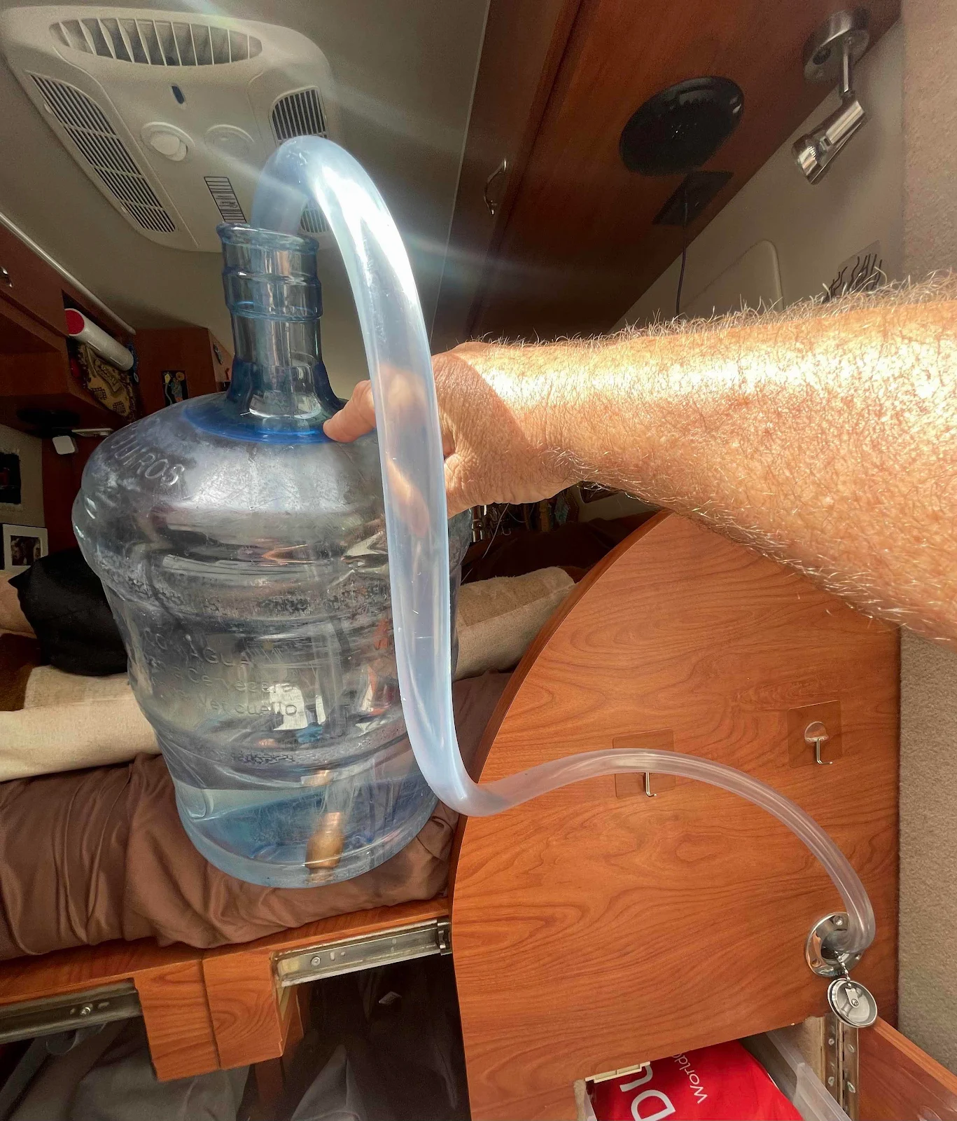 Behind the window covers we have a filler which we use to fill our 30 gallon water tank with purified water which we buy as we go and siphon into the tank. We have a filler system for a hose as well but we only use that where the water system is safe to drink.