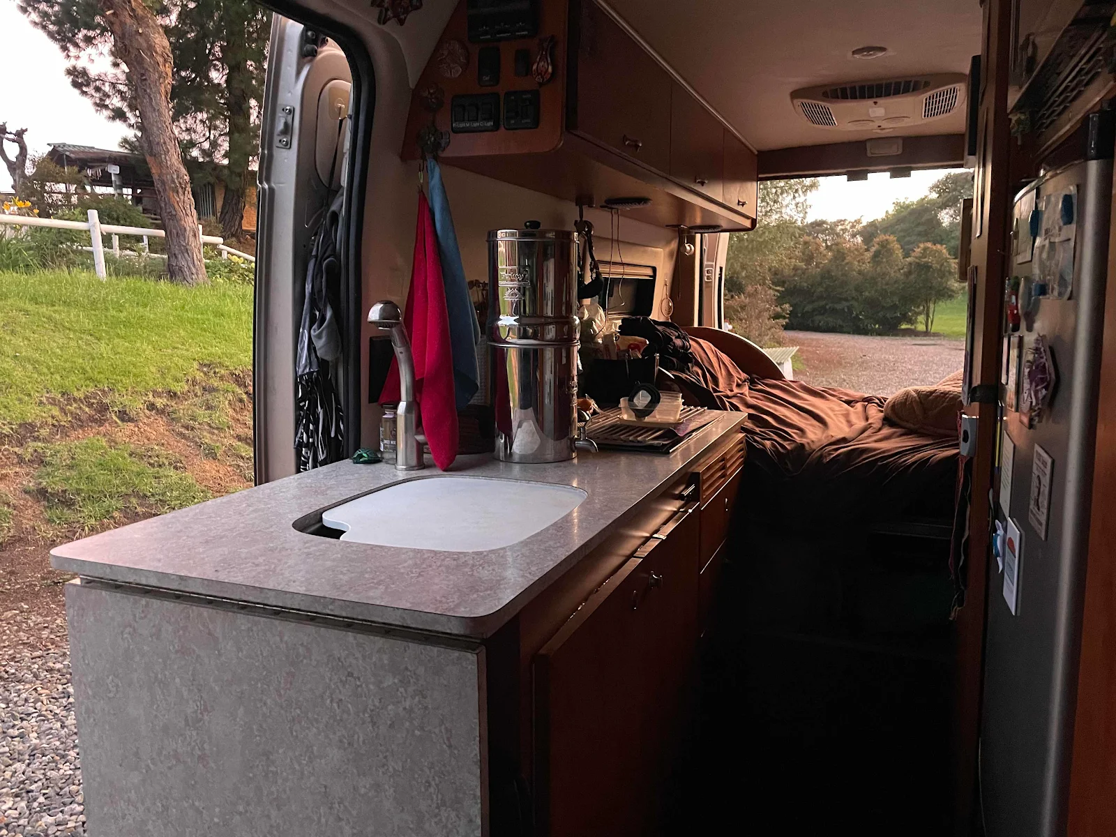 We have no propane in the van and like the toilet this was planned so we could travel abroad without relying on North American camping infrastructure. In South America every country uses different tanks and filler systems. Layne’s kitchen has a twin burner induction stove, and a microwave and an air fryer as well as a collapsing silicon kettle. We have 600 amps of lithium batteries under our bed to power all this as well as our air conditioning.
