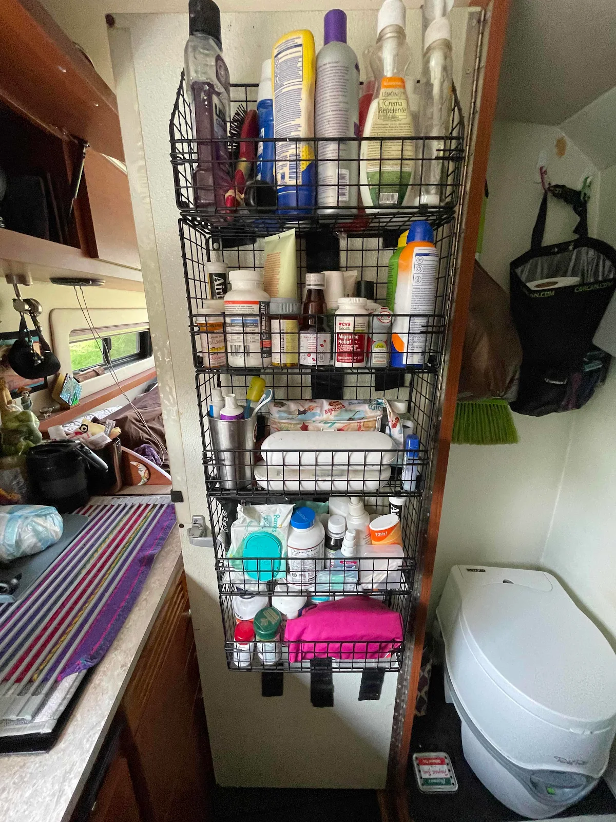 In Panama Sergio also created a shoe locker for us out of some wasted space. This was designed as a footstool for Layne sitting at her table but she never used it preferring a more convenient kitchen still we carry. So Sergio opened up the space for us very successfully.