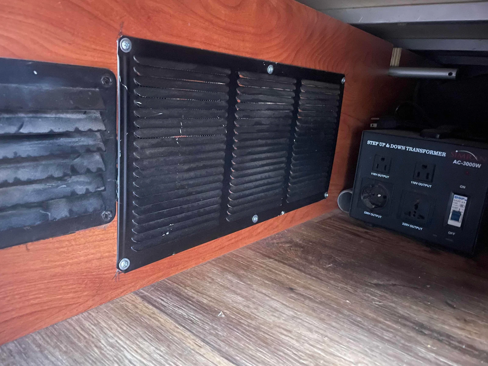 Another problem Sergio solved for us in Panama was the occasional inverter overheating issue. We have a 3,000 watt inverter that turns twelve volt electricity into 110 volt household electricity. By opening up the compartment to more airflow the inverter no longer overheats on hot days. Success! Behind the grille you can see our up/down transformer, a heavy black box. South of Ecuador shorepower goes from US style 110 volts to European style 220 volts. The thirty pound black box will convert 220 to 110 so we will be able to charge our batteries in the southern countries of this continent. So many things to think of!