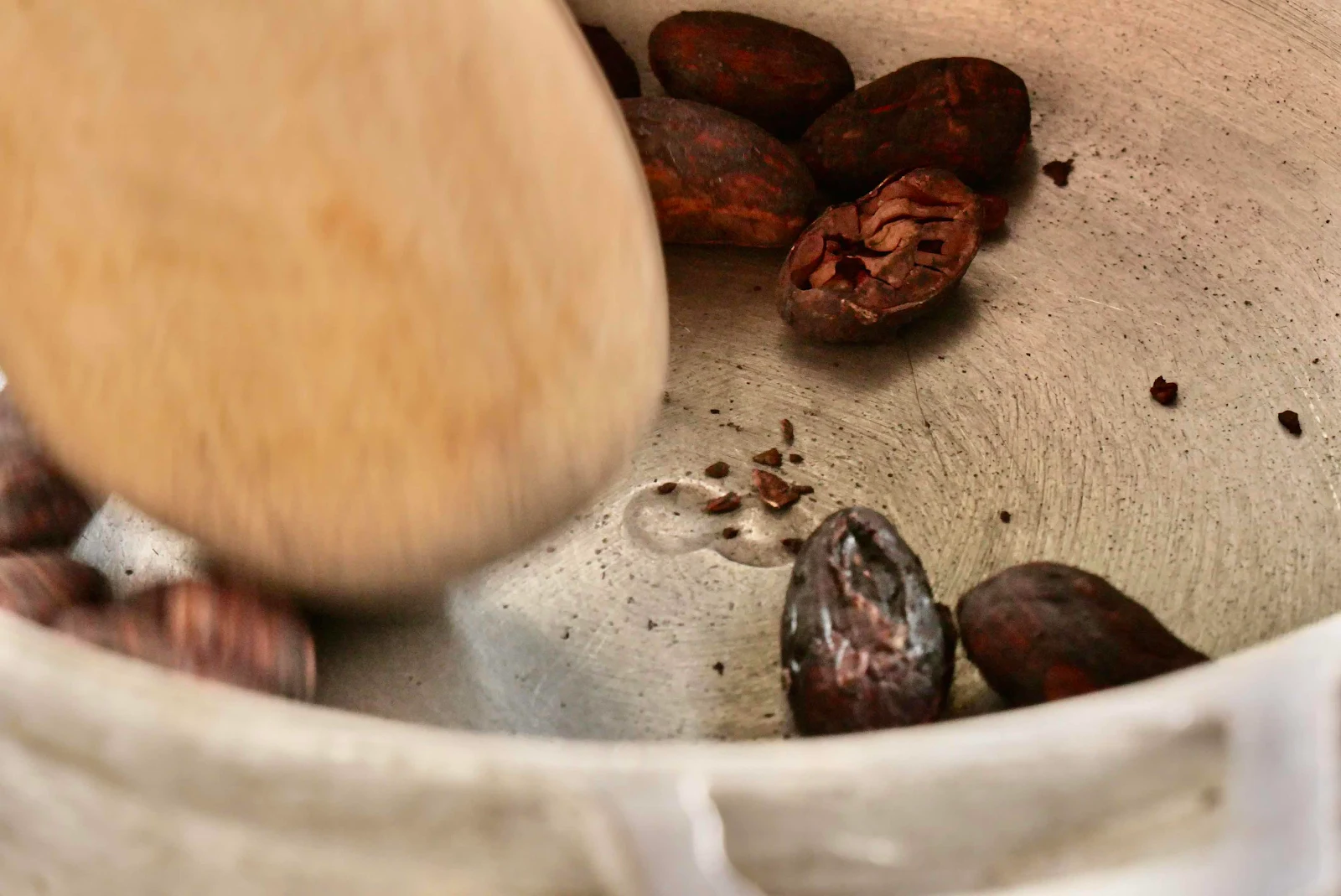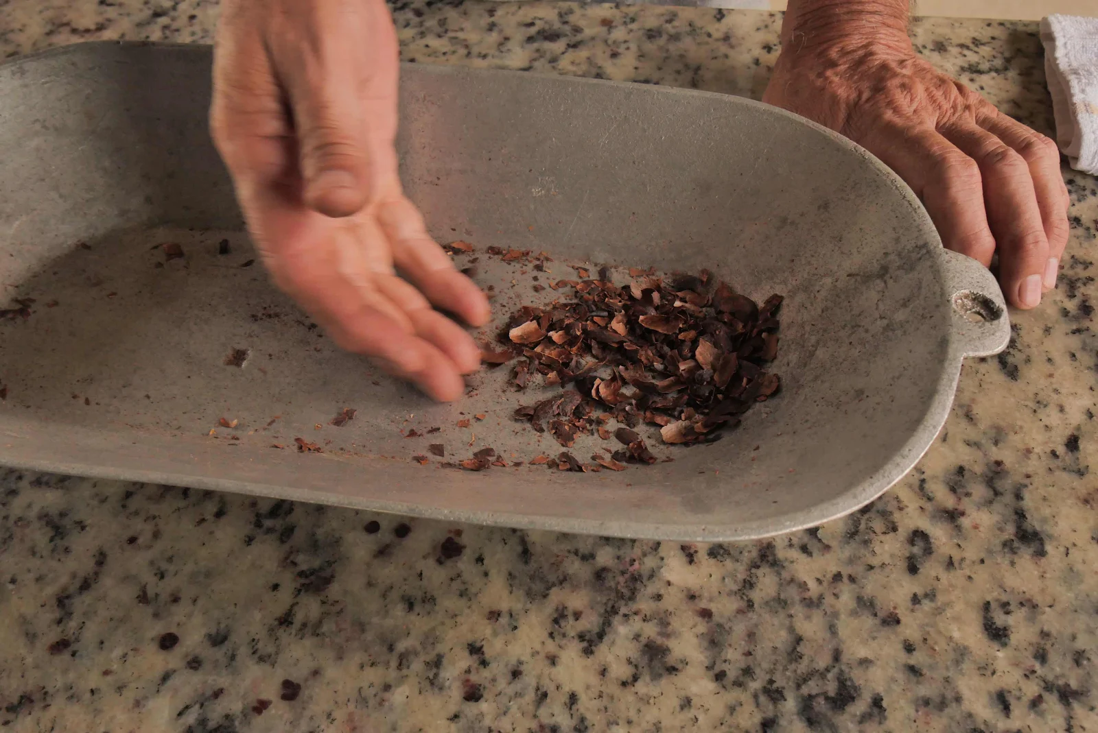 One takes the roasted nuts and sets aside the shells for use in cosmetics and grinds the chocolate to produce nibs which are said to be the healthiest way to eat chocolate.