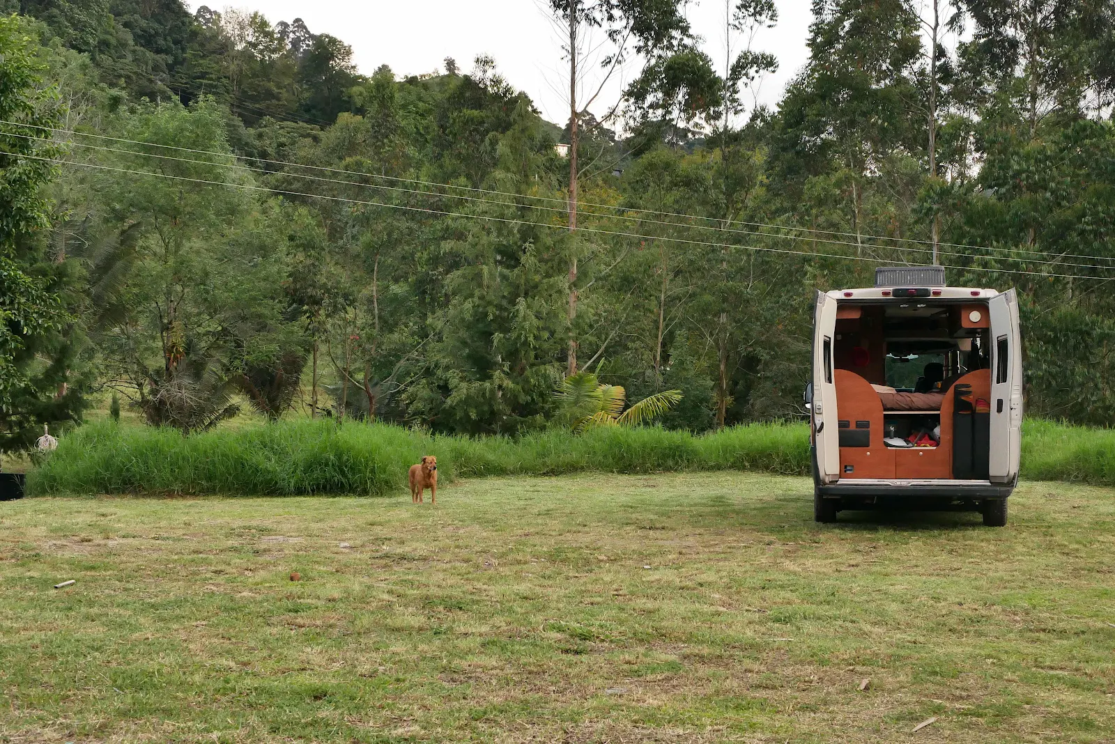 iOverlander’s instructions were to park on the grass outside the hotel parking lot and there we were, alone level and with the sound of the rushing river and views of the hills and distant passing horseback riders. It felt like one of our wild camps on public land in Colorado.