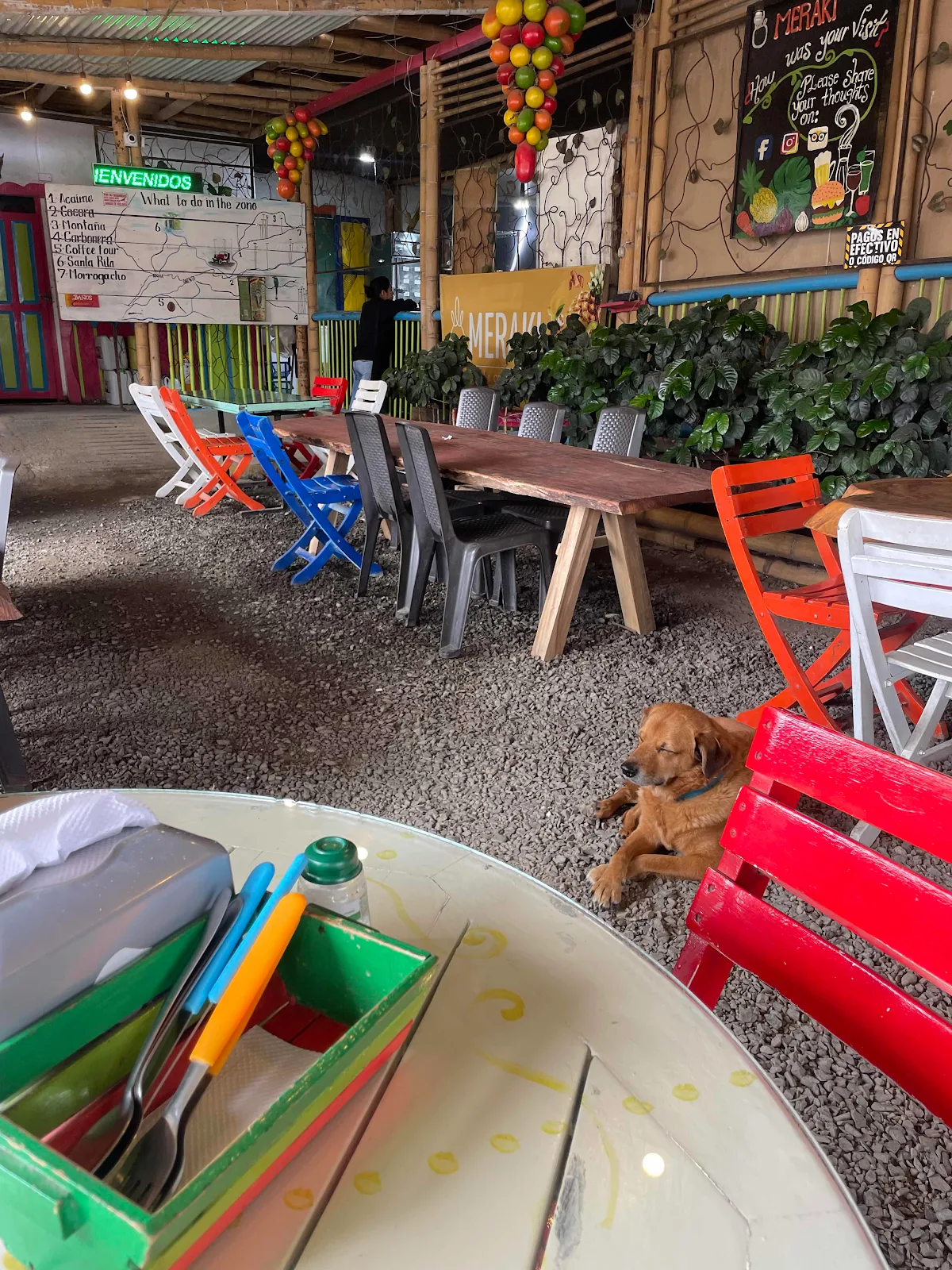 Sleeping, not dead I promise. Dogs are very well cared for in Colombia. Most are loved and even the few street dogs are well fed. I want to take them home but Layne and Rusty yell at me. Especially Rusty.