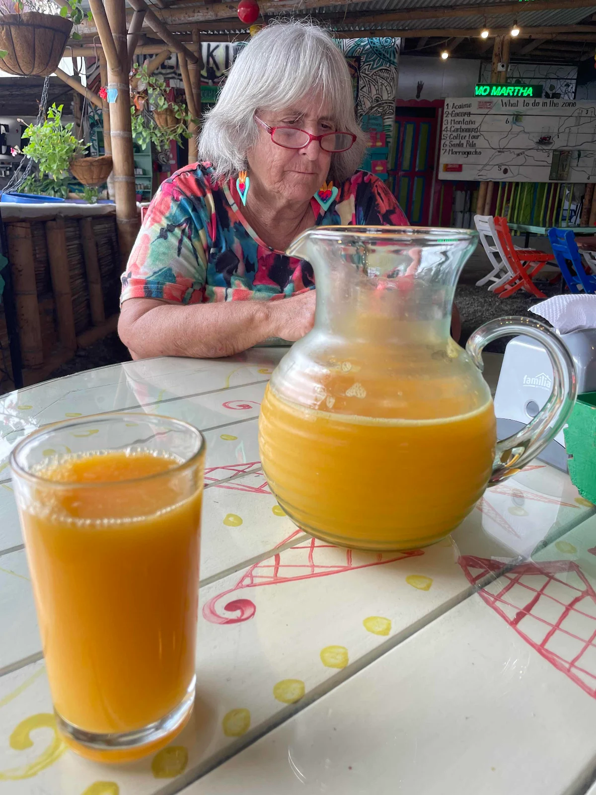 That is a jug of passion fruit juice. Jugs are any size they feel like, some are two glass affairs, this had more than we could drink so Layne filled her Tervis tumbler and put it in the fridge.