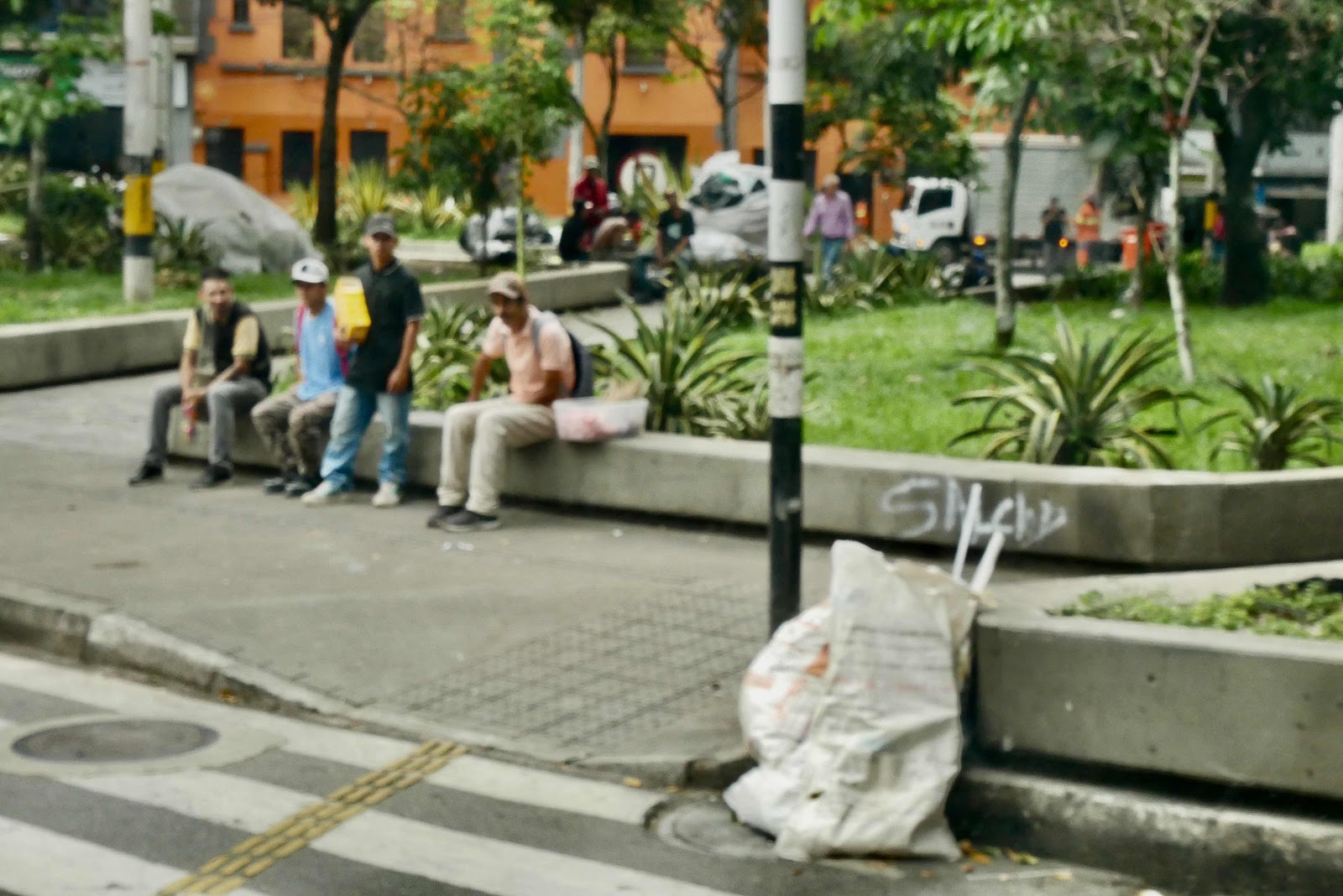 I snagged the photo above of a guy huffing something unsavory at Plaza Botero. His buddies down the sidewalk were hustling something and though I won’t show you unless you ask nicely the flowerbeds were full of human faeces and sawdust in an effort to dry the place up. The stench was foul as you might imagine.